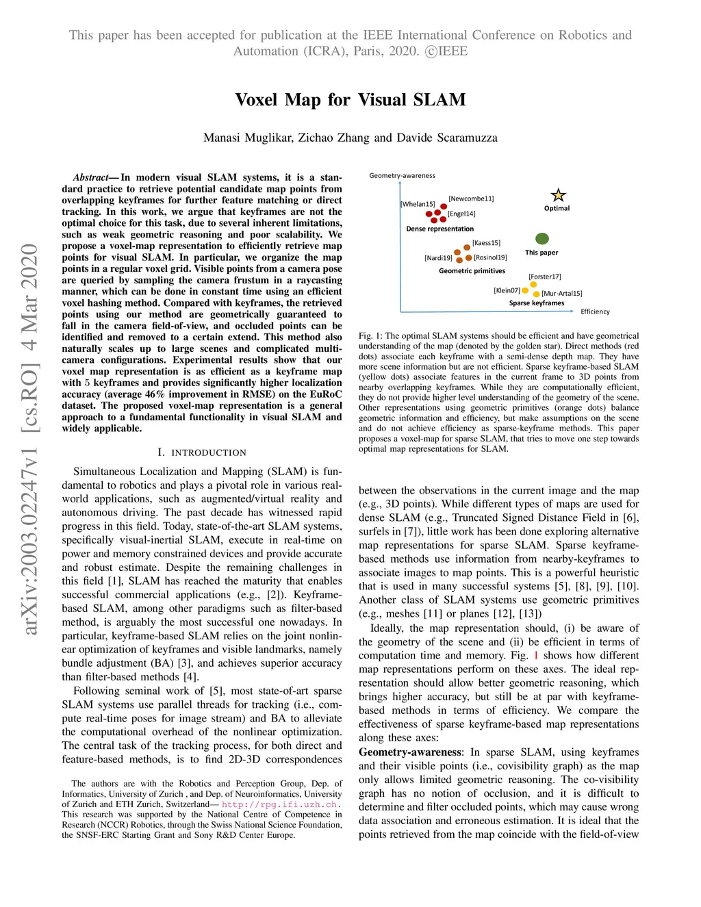In modern visual SLAM systems, it is a standard practice to retrieve potential candidate map points from overlapping keyframes for further feature matching or direct tracking. In this work, we argue that keyframes are not the optimal choice for this task, due to several inherent limitations, such as weak geometric reasoning and poor scalability. We propose a voxel-map representation to efficiently retrieve map points for visual SLAM. In particular, we organize the map points in a regular voxel grid. Visible points from a camera pose are queried by sampling the camera frustum in a raycasting manner, which can be done in constant time using an efficient voxel hashing method. Compared with keyframes, the retrieved points using our method are geometrically guaranteed to fall in the camera field-of-view, and occluded points can be identified and removed to a certain extend. This method also naturally scales up to large scenes and complicated multicamera configurations. Experimental results show that our voxel map representation is as efficient as a keyframe map with 5 keyframes and provides significantly higher localization accuracy (average 46% improvement in RMSE) on the EuRoC dataset. The proposed voxel-map representation is a general approach to a fundamental functionality in visual SLAM and widely applicable.