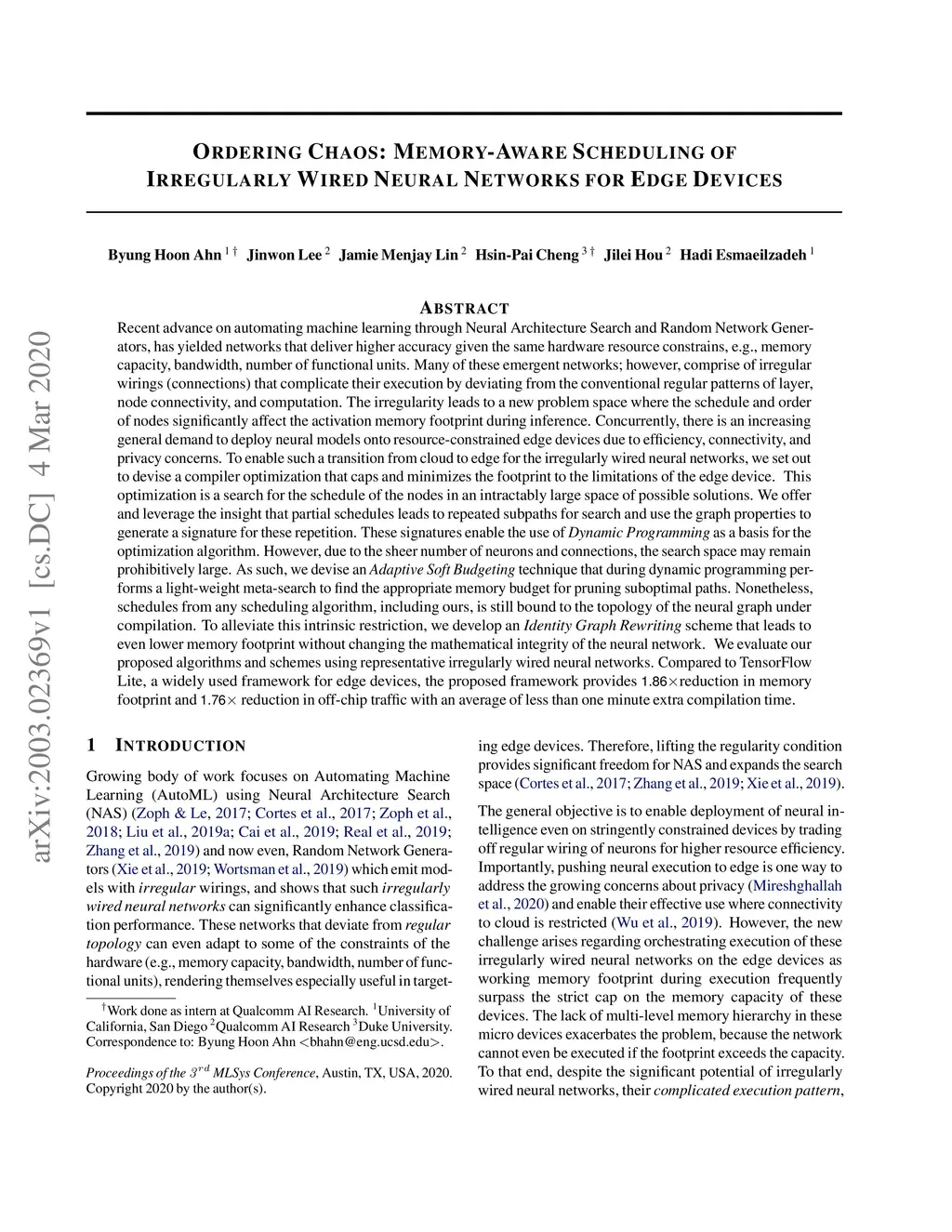 Recent advances demonstrate that irregularly wired neural networks from Neural Architecture Search (NAS) and Random Wiring can not only automate the design of deep neural networks but also emit models that outperform previous manual designs. These designs are especially effective while designing neural architectures under hard resource constraints (memory, MACs, . . . ) which highlights the importance of this class of designing neural networks. However, such a move creates complication in the previously streamlined pattern of execution. In fact one of the main challenges is that the order of such nodes in the neural network significantly effects the memory footprint of the intermediate activations. Current compilers do not schedule with regard to activation memory footprint that it significantly increases its peak compared to the optimum, rendering it not applicable for edge devices. To address this standing issue, we present a memory-aware compiler, dubbed SERENITY, that utilizes dynamic programming to find a sequence that finds a schedule with optimal memory footprint. Our solution also comprises of graph rewriting technique that allows further reduction beyond the optimum. As such, SERENITY achieves optimal peak memory, and the graph rewriting technique further improves this resulting in 1.68x improvement with dynamic programming-based scheduler and 1.86x with graph rewriting, against TensorFlow Lite with less than one minute overhead.