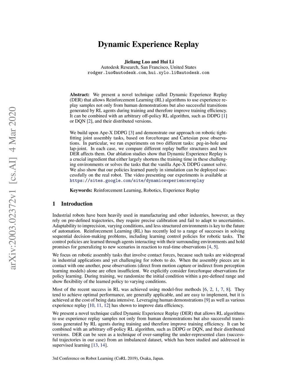 We present a novel technique called Dynamic Experience Replay (DER) that allows Reinforcement Learning (RL) algorithms to use experience replay samples not only from human demonstrations but also successful transitions generated by RL agents during training and therefore improve training efficiency. It can be combined with an arbitrary off-policy RL algorithm, such as DDPG or DQN, and their distributed versions. We build upon Ape-X DDPG and demonstrate our approach on robotic tight-fitting joint assembly tasks, based on force/torque and Cartesian pose observations. In particular, we run experiments on two different tasks: peg-in-hole and lap-joint. In each case, we compare different replay buffer structures and how DER affects them. Our ablation studies show that Dynamic Experience Replay is a crucial ingredient that either largely shortens the training time in these challenging environments or solves the tasks that the vanilla Ape-X DDPG cannot solve. We also show that our policies learned purely in simulation can be deployed successfully on the real robot. The video presenting our experiments is available at https://sites.google.com/site/dynamicexperiencereplay