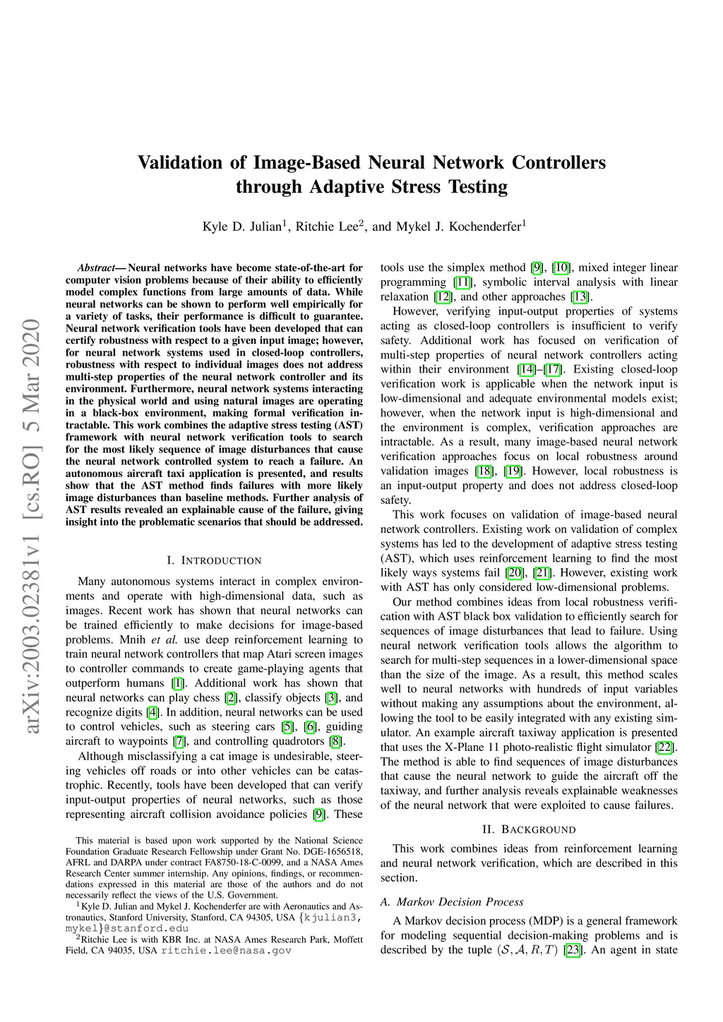 Neural networks have become state-of-the-art for computer vision problems because of their ability to efficiently model complex functions from large amounts of data. While neural networks can be shown to perform well empirically for a variety of tasks, their performance is difficult to guarantee. Neural network verification tools have been developed that can certify robustness with respect to a given input image; however, for neural network systems used in closed-loop controllers, robustness with respect to individual images does not address multi-step properties of the neural network controller and its environment. Furthermore, neural network systems interacting in the physical world and using natural images are operating in a black-box environment, making formal verification intractable. This work combines the adaptive stress testing (AST) framework with neural network verification tools to search for the most likely sequence of image disturbances that cause the neural network controlled system to reach a failure. An autonomous aircraft taxi application is presented, and results show that the AST method finds failures with more likely image disturbances than baseline methods. Further analysis of AST results revealed an explainable cause of the failure, giving insight into the problematic scenarios that should be addressed.