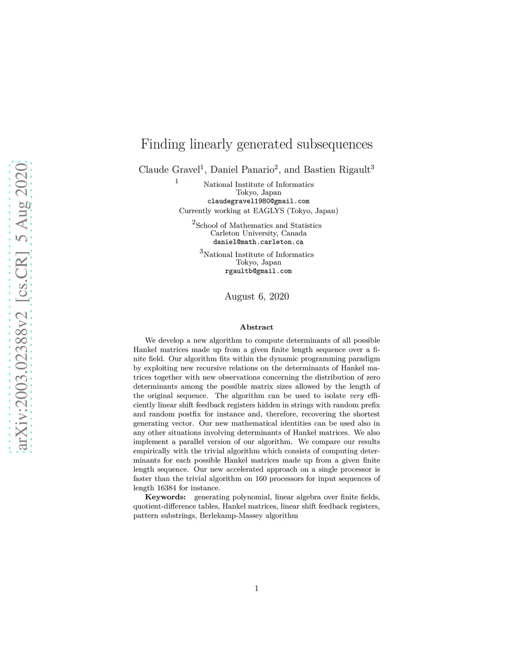 We develop a new algorithm to compute determinants of all possible Hankel matrices made up from a given finite length sequence over a finite field. Our algorithm fits within the dynamic programming paradigm by exploiting new recursive relations on the determinants of Hankel matrices together with new observations concerning the distribution of zero determinants among the possible matrix sizes allowed by the length of the original sequence. The algorithm can be used to isolate \emph{very} efficiently linear shift feedback registers hidden in strings with random prefix and random postfix for instance and, therefore, recovering the shortest generating vector. Our new mathematical identities can be used also in any other situations involving determinants of Hankel matrices. We also implement a parallel version of our algorithm. We compare our results empirically with the trivial algorithm which consists of computing determinants for each possible Hankel matrices made up from a given finite length sequence. Our new accelerated approach on a single processor is faster than the trivial algorithm on 160 processors for input sequences of length 16384 for instance.