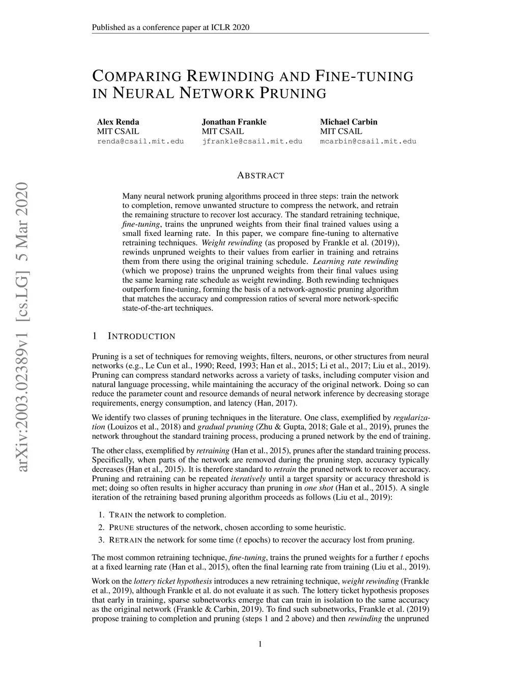 Many neural network pruning algorithms proceed in three steps: train the network to completion, remove unwanted structure to compress the network, and retrain the remaining structure to recover lost accuracy. The standard retraining technique, fine-tuning, trains the unpruned weights from their final trained values using a small fixed learning rate. In this paper, we compare fine-tuning to alternative retraining techniques. Weight rewinding (as proposed by Frankle et al., (2019)), rewinds unpruned weights to their values from earlier in training and retrains them from there using the original training schedule. Learning rate rewinding (which we propose) trains the unpruned weights from their final values using the same learning rate schedule as weight rewinding. Both rewinding techniques outperform fine-tuning, forming the basis of a network-agnostic pruning algorithm that matches the accuracy and compression ratios of several more network-specific state-of-the-art techniques.