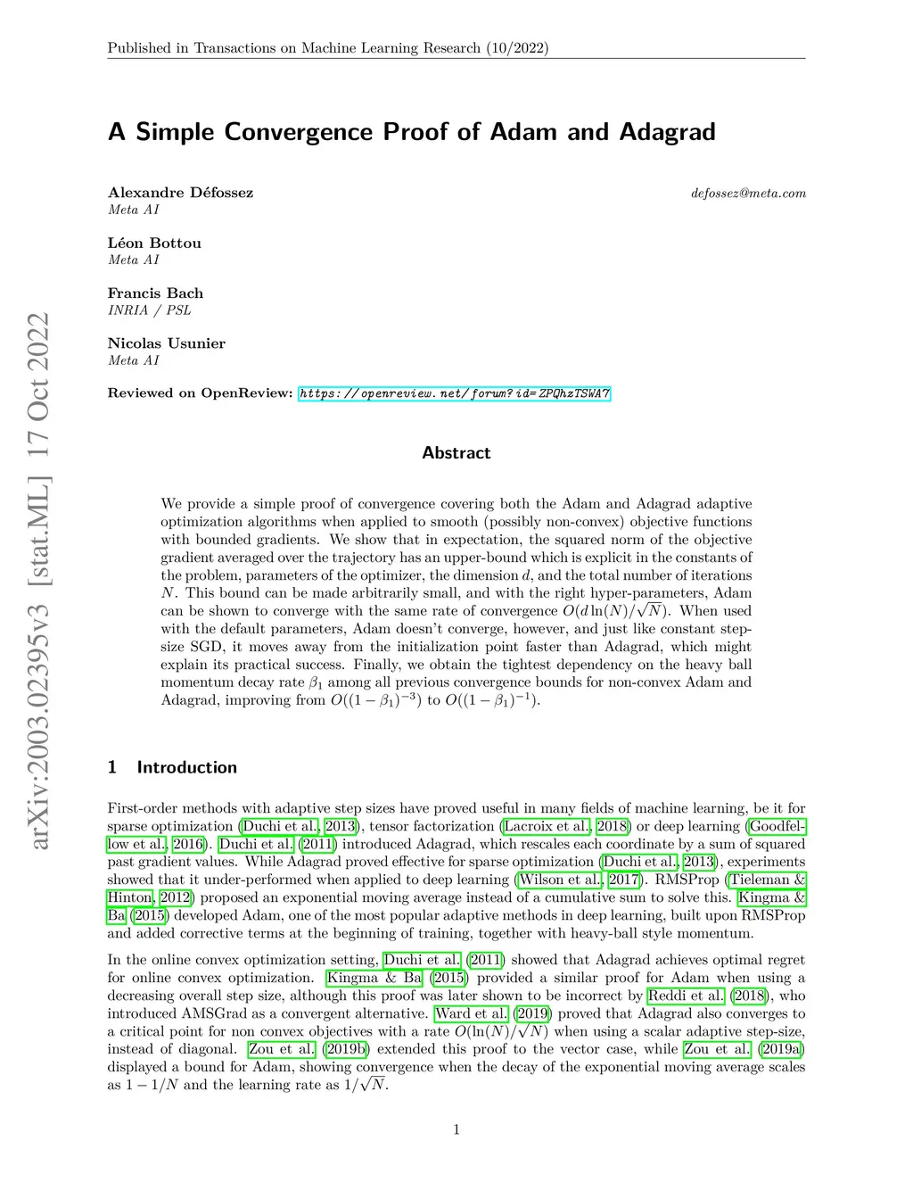 We provide a simple proof of convergence covering both the Adam and Adagrad adaptive optimization algorithms when applied to smooth (possibly non-convex) objective functions with bounded gradients. We show that in expectation, the squared norm of the objective gradient averaged over the trajectory has an upper-bound which is explicit in the constants of the problem, parameters of the optimizer, the dimension , and the total number of iterations . This bound can be made arbitrarily small, and with the right hyper-parameters, Adam can be shown to converge with the same rate of convergence . When used with the default parameters, Adam doesn't converge, however, and just like constant step-size SGD, it moves away from the initialization point faster than Adagrad, which might explain its practical success. Finally, we obtain the tightest dependency on the heavy ball momentum decay rate among all previous convergence bounds for non-convex Adam and Adagrad, improving from to .