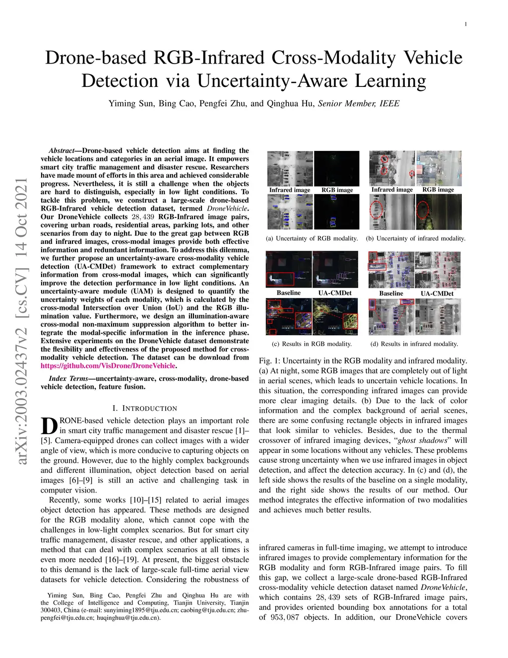 Drone-based vehicle detection aims at finding the vehicle locations and categories in an aerial image. It empowers smart city traffic management and disaster rescue. Researchers have made mount of efforts in this area and achieved considerable progress. Nevertheless, it is still a challenge when the objects are hard to distinguish, especially in low light conditions. To tackle this problem, we construct a large-scale drone-based RGB-Infrared vehicle detection dataset, termed DroneVehicle. Our DroneVehicle collects 28, 439 RGB-Infrared image pairs, covering urban roads, residential areas, parking lots, and other scenarios from day to night. Due to the great gap between RGB and infrared images, cross-modal images provide both effective information and redundant information. To address this dilemma, we further propose an uncertainty-aware cross-modality vehicle detection (UA-CMDet) framework to extract complementary information from cross-modal images, which can significantly improve the detection performance in low light conditions. An uncertainty-aware module (UAM) is designed to quantify the uncertainty weights of each modality, which is calculated by the cross-modal Intersection over Union (IoU) and the RGB illumination value. Furthermore, we design an illumination-aware cross-modal non-maximum suppression algorithm to better integrate the modal-specific information in the inference phase. Extensive experiments on the DroneVehicle dataset demonstrate the flexibility and effectiveness of the proposed method for crossmodality vehicle detection. The dataset can be download from https://github.com/VisDrone/DroneVehicle.