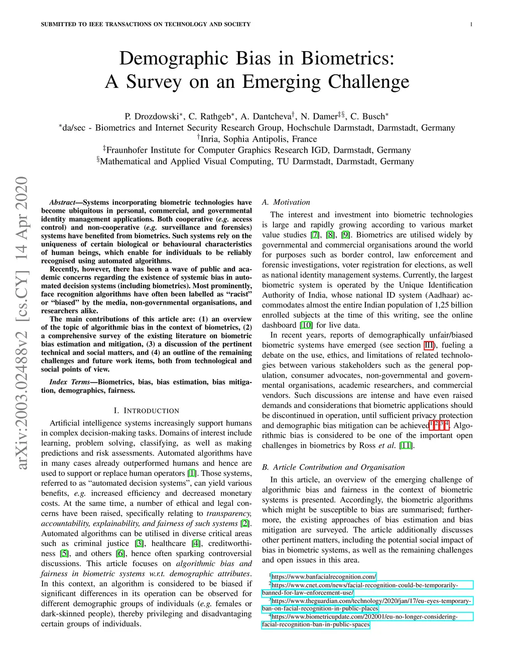 Systems incorporating biometric technologies have become ubiquitous in personal, commercial, and governmental identity management applications. Both cooperative (e.g. access control) and non-cooperative (e.g. surveillance and forensics) systems have benefited from biometrics. Such systems rely on the uniqueness of certain biological or behavioural characteristics of human beings, which enable for individuals to be reliably recognised using automated algorithms. Recently, however, there has been a wave of public and academic concerns regarding the existence of systemic bias in automated decision systems (including biometrics). Most prominently, face recognition algorithms have often been labelled as "racist" or "biased" by the media, non-governmental organisations, and researchers alike. The main contributions of this article are: (1) an overview of the topic of algorithmic bias in the context of biometrics, (2) a comprehensive survey of the existing literature on biometric bias estimation and mitigation, (3) a discussion of the pertinent technical and social matters, and (4) an outline of the remaining challenges and future work items, both from technological and social points of view.