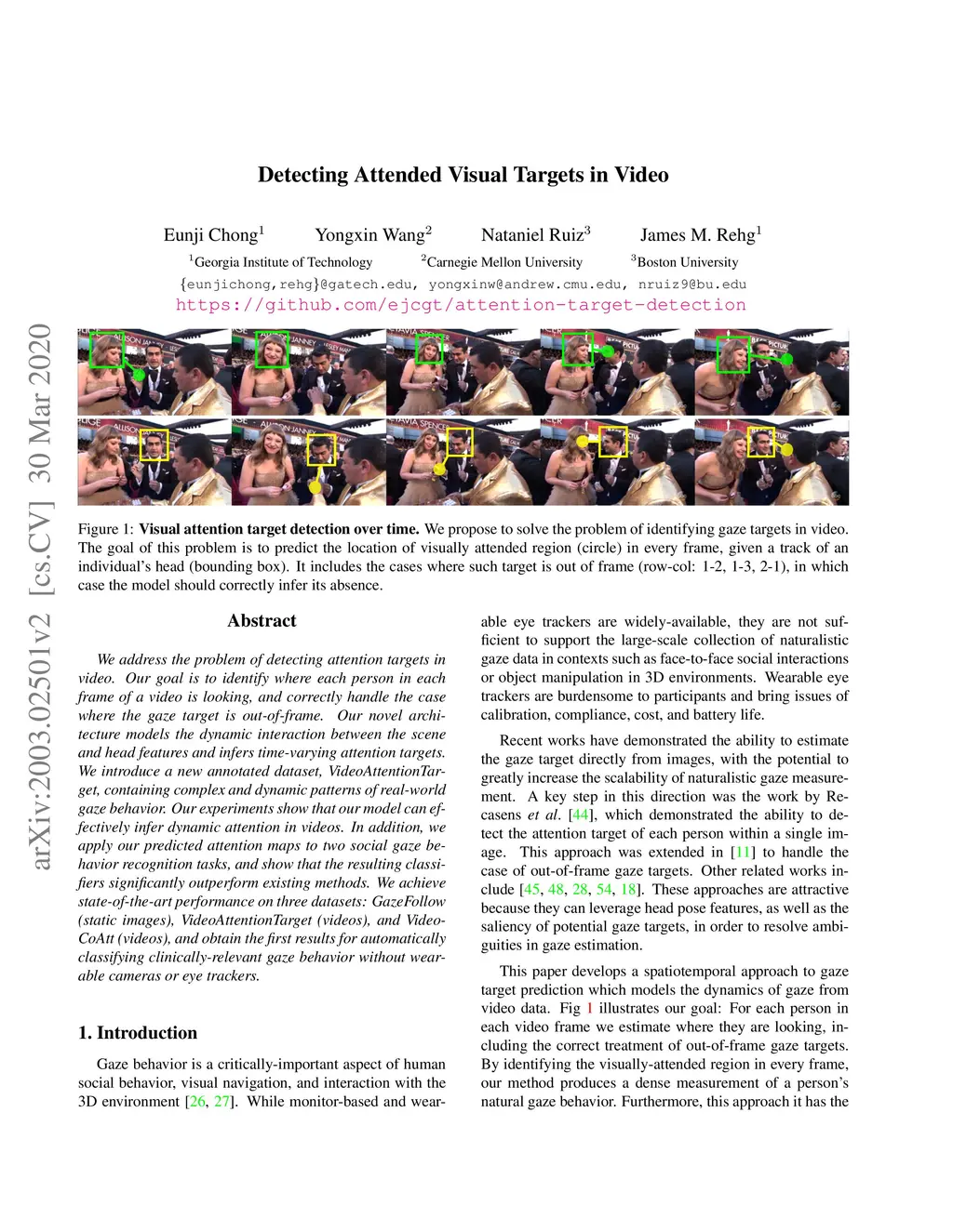 We address the problem of detecting attention targets in video. Our goal is to identify where each person in each frame of a video is looking, and correctly handle the case where the gaze target is out-of-frame. Our novel architecture models the dynamic interaction between the scene and head features and infers time-varying attention targets. We introduce a new annotated dataset, VideoAttentionTarget, containing complex and dynamic patterns of real-world gaze behavior. Our experiments show that our model can effectively infer dynamic attention in videos. In addition, we apply our predicted attention maps to two social gaze behavior recognition tasks, and show that the resulting classifiers significantly outperform existing methods. We achieve state-of-the-art performance on three datasets: GazeFollow (static images), VideoAttentionTarget (videos), and VideoCoAtt (videos), and obtain the first results for automatically classifying clinically-relevant gaze behavior without wearable cameras or eye trackers.