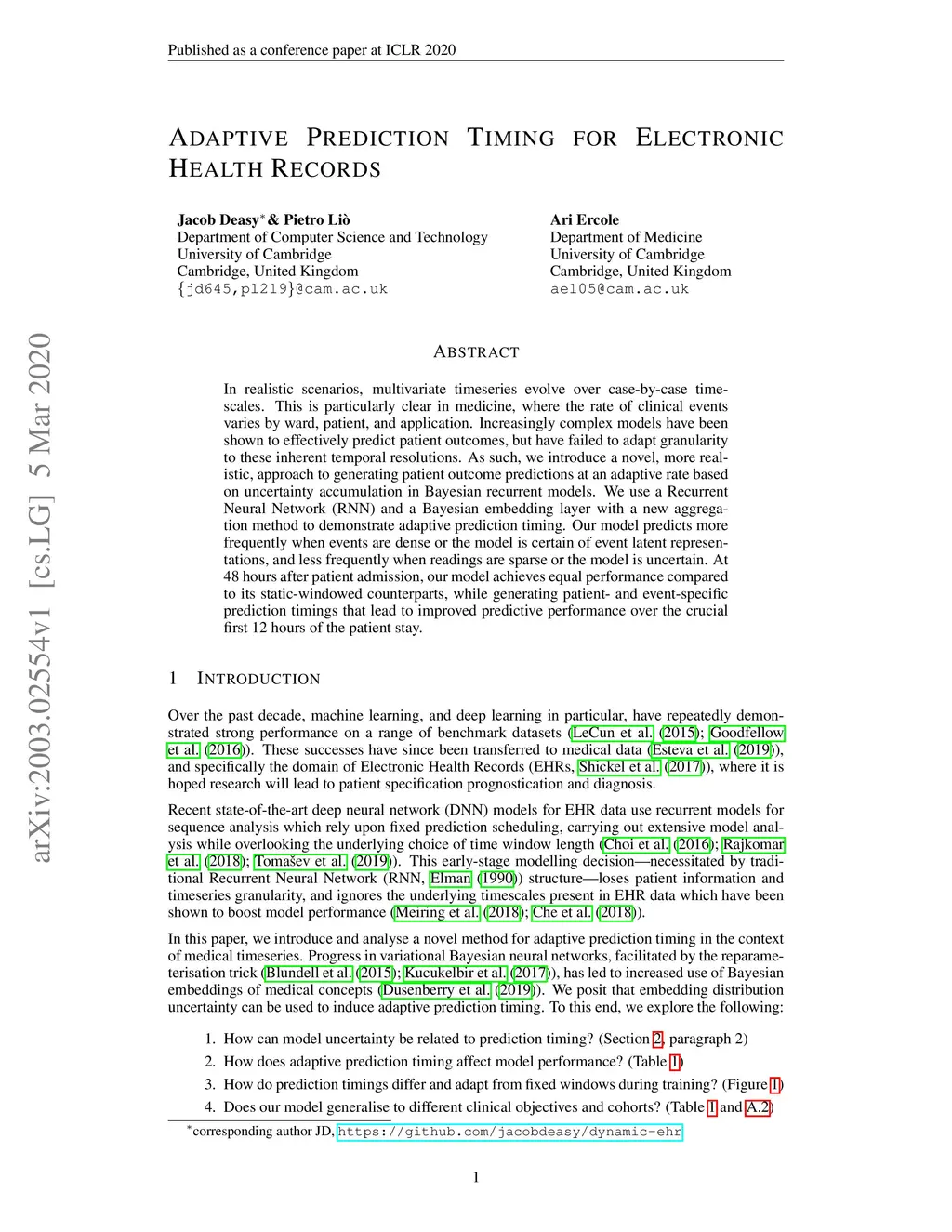 In realistic scenarios, multivariate timeseries evolve over case-by-case time-scales. This is particularly clear in medicine, where the rate of clinical events varies by ward, patient, and application. Increasingly complex models have been shown to effectively predict patient outcomes, but have failed to adapt granularity to these inherent temporal resolutions. As such, we introduce a novel, more realistic, approach to generating patient outcome predictions at an adaptive rate based on uncertainty accumulation in Bayesian recurrent models. We use a Recurrent Neural Network (RNN) and a Bayesian embedding layer with a new aggregation method to demonstrate adaptive prediction timing. Our model predicts more frequently when events are dense or the model is certain of event latent representations, and less frequently when readings are sparse or the model is uncertain. At 48 hours after patient admission, our model achieves equal performance compared to its static-windowed counterparts, while generating patient- and event-specific prediction timings that lead to improved predictive performance over the crucial first 12 hours of the patient stay.