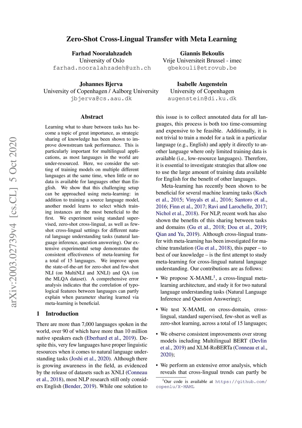 Learning what to share between tasks has been a topic of great importance recently, as strategic sharing of knowledge has been shown to improve downstream task performance. This is particularly important for multilingual applications, as most languages in the world are under-resourced. Here, we consider the setting of training models on multiple different languages at the same time, when little or no data is available for languages other than English. We show that this challenging setup can be approached using meta-learning, where, in addition to training a source language model, another model learns to select which training instances are the most beneficial to the first. We experiment using standard supervised, zero-shot cross-lingual, as well as few-shot cross-lingual settings for different natural language understanding tasks (natural language inference, question answering). Our extensive experimental setup demonstrates the consistent effectiveness of meta-learning for a total of 15 languages. We improve upon the state-of-the-art for zero-shot and few-shot NLI (on MultiNLI and XNLI) and QA (on the MLQA dataset). A comprehensive error analysis indicates that the correlation of typological features between languages can partly explain when parameter sharing learned via meta-learning is beneficial.