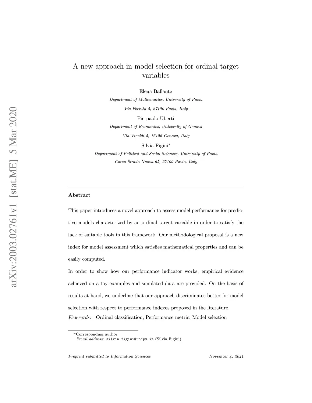 This paper introduces a novel approach to assess model performance for predictive models characterized by an ordinal target variable in order to satisfy the lack of suitable tools in this framework. Our methodological proposal is a new index for model assessment which satisfies mathematical properties and can be easily computed. In order to show how our performance indicator works, empirical evidence achieved on a toy examples and simulated data are provided. On the basis of results at hand, we underline that our approach discriminates better for model selection with respect to performance indexes proposed in the literature.