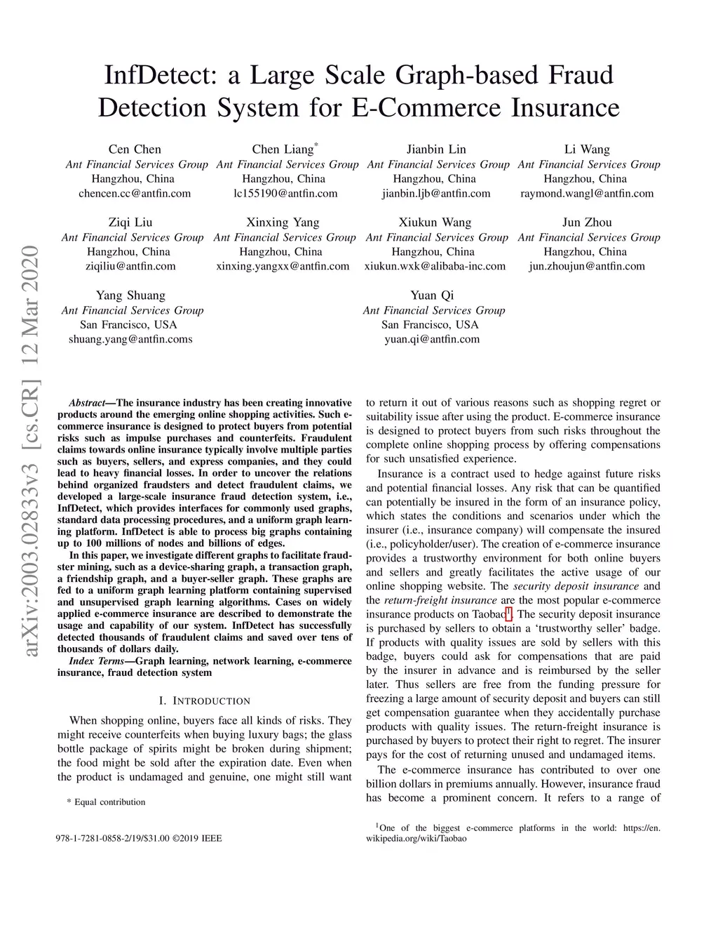 The insurance industry has been creating innovative products around the emerging online shopping activities. Such e-commerce insurance is designed to protect buyers from potential risks such as impulse purchases and counterfeits. Fraudulent claims towards online insurance typically involve multiple parties such as buyers, sellers, and express companies, and they could lead to heavy financial losses. In order to uncover the relations behind organized fraudsters and detect fraudulent claims, we developed a large-scale insurance fraud detection system, i.e., InfDetect, which provides interfaces for commonly used graphs, standard data processing procedures, and a uniform graph learning platform. InfDetect is able to process big graphs containing up to 100 millions of nodes and billions of edges. In this paper, we investigate different graphs to facilitate fraudster mining, such as a device-sharing graph, a transaction graph, a friendship graph, and a buyer-seller graph. These graphs are fed to a uniform graph learning platform containing supervised and unsupervised graph learning algorithms. Cases on widely applied e-commerce insurance are described to demonstrate the usage and capability of our system. InfDetect has successfully detected thousands of fraudulent claims and saved over tens of thousands of dollars daily.