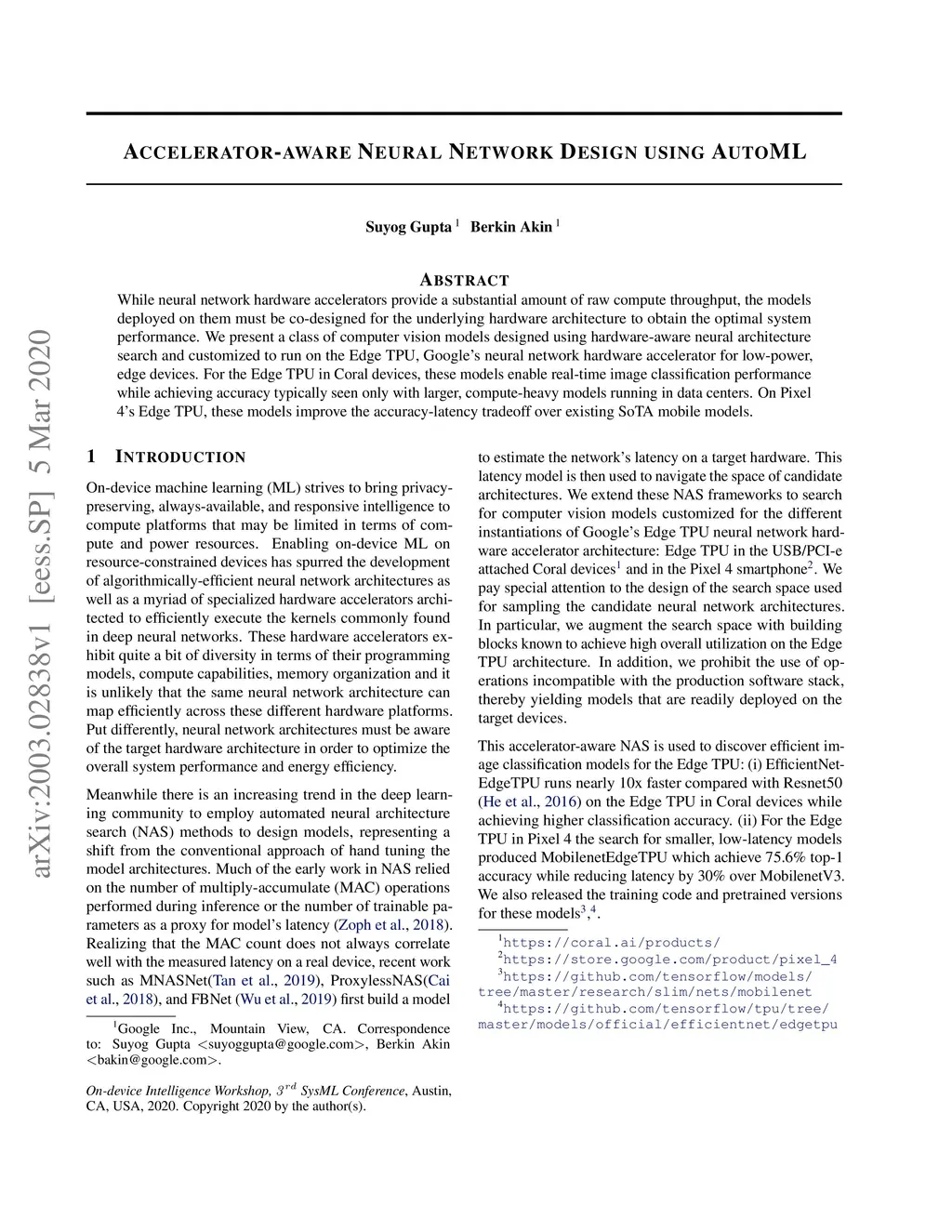 While neural network hardware accelerators provide a substantial amount of raw compute throughput, the models deployed on them must be co-designed for the underlying hardware architecture to obtain the optimal system performance. We present a class of computer vision models designed using hardware-aware neural architecture search and customized to run on the Edge TPU, Google's neural network hardware accelerator for low-power, edge devices. For the Edge TPU in Coral devices, these models enable real-time image classification performance while achieving accuracy typically seen only with larger, compute-heavy models running in data centers. On Pixel 4's Edge TPU, these models improve the accuracy-latency tradeoff over existing SoTA mobile models.
