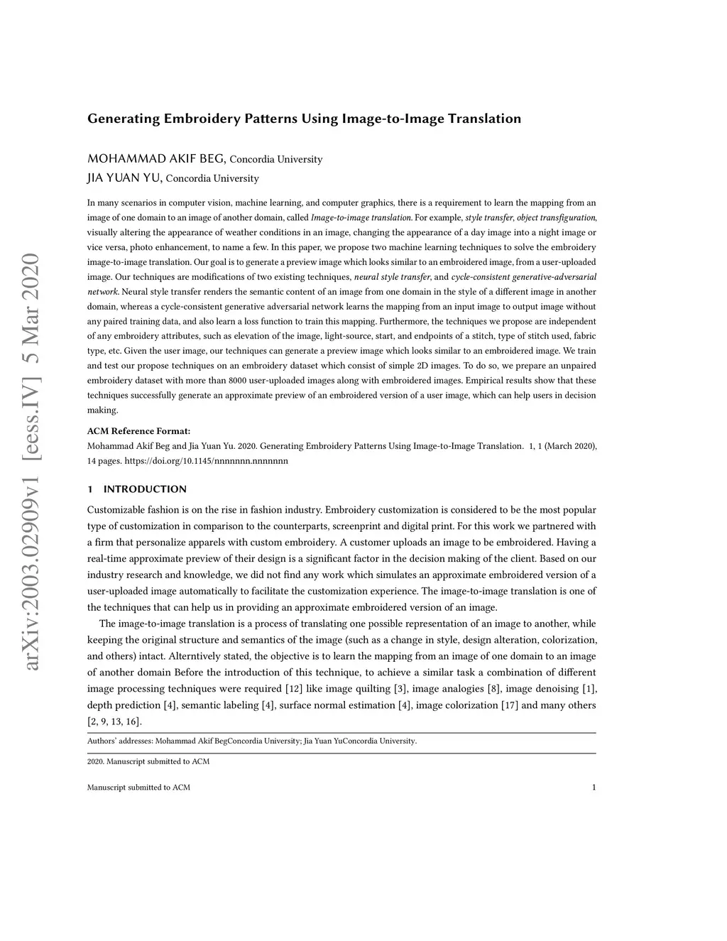 In many scenarios in computer vision, machine learning, and computer graphics, there is a requirement to learn the mapping from an image of one domain to an image of another domain, called Image-to-image translation. For example, style transfer, object transfiguration, visually altering the appearance of weather conditions in an image, changing the appearance of a day image into a night image or vice versa, photo enhancement, to name a few. In this paper, we propose two machine learning techniques to solve the embroidery image-to-image translation. Our goal is to generate a preview image which looks similar to an embroidered image, from a user-uploaded image. Our techniques are modifications of two existing techniques, neural style transfer, and cycle-consistent generative-adversarial network. Neural style transfer renders the semantic content of an image from one domain in the style of a different image in another domain, whereas a cycle-consistent generative adversarial network learns the mapping from an input image to output image without any paired training data, and also learn a loss function to train this mapping. Furthermore, the techniques we propose are independent of any embroidery attributes, such as elevation of the image, light-source, start, and endpoints of a stitch, type of stitch used, fabric type, etc. Given the user image, our techniques can generate a preview image which looks similar to an embroidered image. We train and test our propose techniques on an embroidery dataset which consist of simple 2D images. To do so, we prepare an unpaired embroidery dataset with more than 8000 user-uploaded images along with embroidered images. Empirical results show that these techniques successfully generate an approximate preview of an embroidered version of a user image, which can help users in decision making.