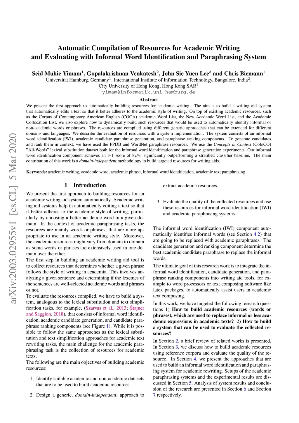 We present the first approach to automatically building resources for academic writing. The aim is to build a writing aid system that automatically edits a text so that it better adheres to the academic style of writing. On top of existing academic resources, such as the Corpus of Contemporary American English (COCA) academic Word List, the New Academic Word List, and the Academic Collocation List, we also explore how to dynamically build such resources that would be used to automatically identify informal or non-academic words or phrases. The resources are compiled using different generic approaches that can be extended for different domains and languages. We describe the evaluation of resources with a system implementation. The system consists of an informal word identification (IWI), academic candidate paraphrase generation, and paraphrase ranking components. To generate candidates and rank them in context, we have used the PPDB and WordNet paraphrase resources. We use the Concepts in Context (CoInCO) "All-Words" lexical substitution dataset both for the informal word identification and paraphrase generation experiments. Our informal word identification component achieves an F-1 score of 82%, significantly outperforming a stratified classifier baseline. The main contribution of this work is a domain-independent methodology to build targeted resources for writing aids.