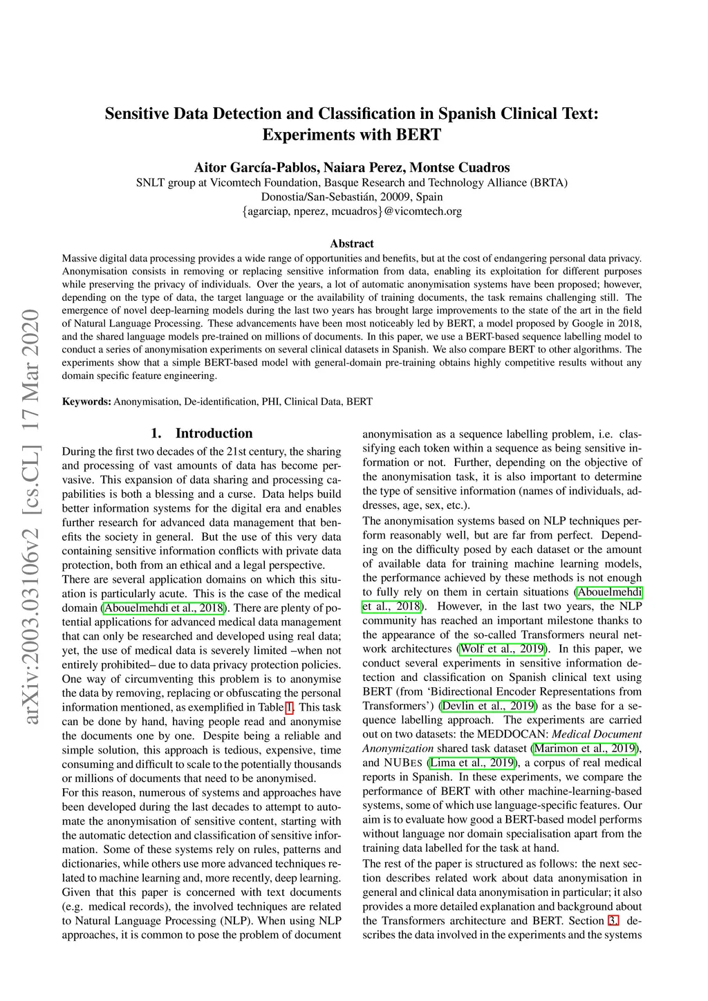 Massive digital data processing provides a wide range of opportunities and benefits, but at the cost of endangering personal data privacy. Anonymisation consists in removing or replacing sensitive information from data, enabling its exploitation for different purposes while preserving the privacy of individuals. Over the years, a lot of automatic anonymisation systems have been proposed; however, depending on the type of data, the target language or the availability of training documents, the task remains challenging still. The emergence of novel deep-learning models during the last two years has brought large improvements to the state of the art in the field of Natural Language Processing. These advancements have been most noticeably led by BERT, a model proposed by Google in 2018, and the shared language models pre-trained on millions of documents. In this paper, we use a BERT-based sequence labelling model to conduct a series of anonymisation experiments on several clinical datasets in Spanish. We also compare BERT to other algorithms. The experiments show that a simple BERT-based model with general-domain pre-training obtains highly competitive results without any domain specific feature engineering.