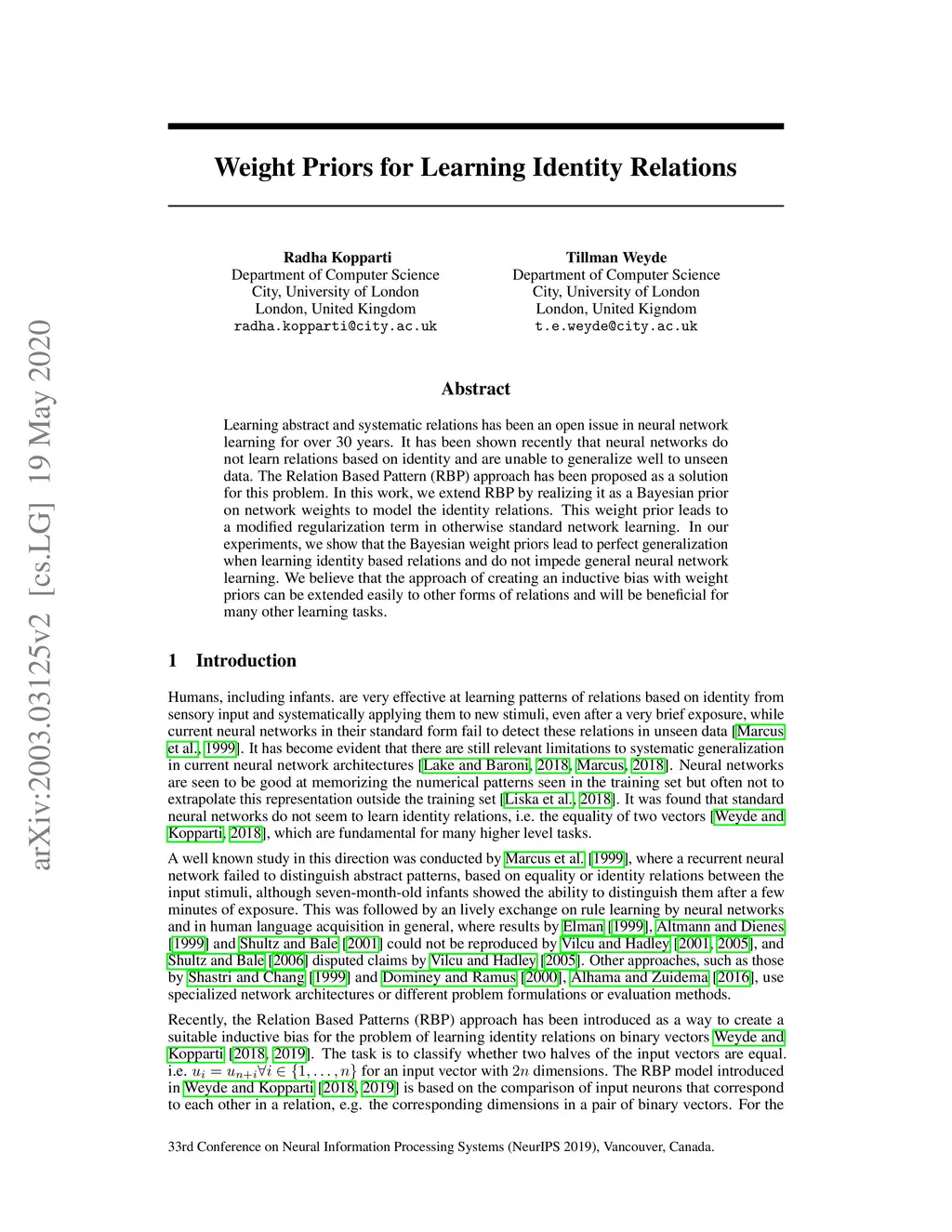 Learning abstract and systematic relations has been an open issue in neural network learning for over 30 years. It has been shown recently that neural networks do not learn relations based on identity and are unable to generalize well to unseen data. The Relation Based Pattern (RBP) approach has been proposed as a solution for this problem. In this work, we extend RBP by realizing it as a Bayesian prior on network weights to model the identity relations. This weight prior leads to a modified regularization term in otherwise standard network learning. In our experiments, we show that the Bayesian weight priors lead to perfect generalization when learning identity based relations and do not impede general neural network learning. We believe that the approach of creating an inductive bias with weight priors can be extended easily to other forms of relations and will be beneficial for many other learning tasks.