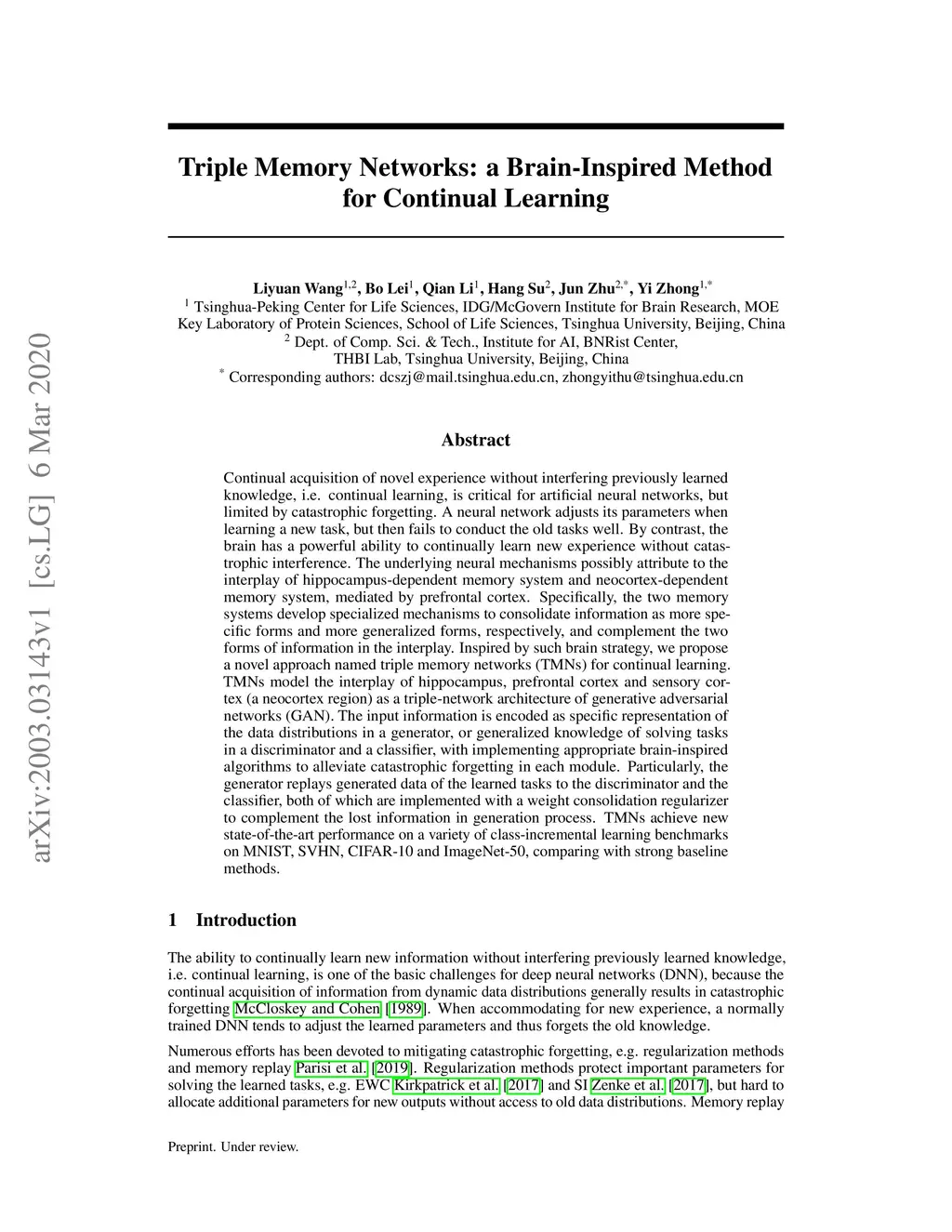 Triple Memory Networks: a Brain-Inspired Method for Continual Learning