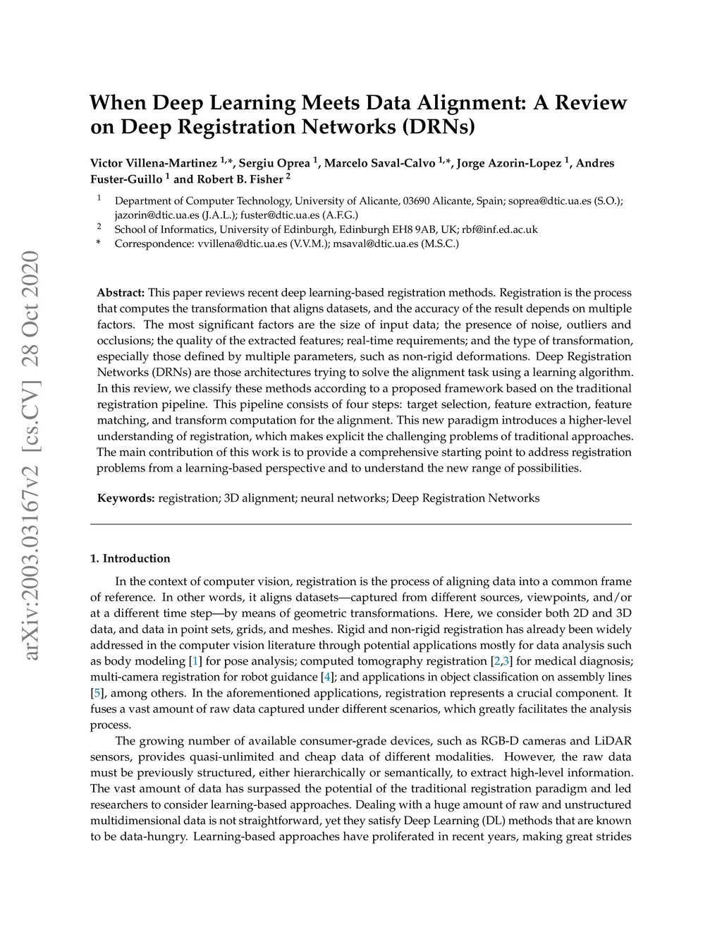Registration is the process that computes the transformation that aligns sets of data. Commonly, a registration process can be divided into four main steps: target selection, feature extraction, feature matching, and transform computation for the alignment. The accuracy of the result depends on multiple factors, the most significant are the quantity of input data, the presence of noise, outliers and occlusions, the quality of the extracted features, real-time requirements and the type of transformation, especially those ones defined by multiple parameters, like non-rigid deformations. Recent advancements in machine learning could be a turning point in these issues, particularly with the development of deep learning (DL) techniques, which are helping to improve multiple computer vision problems through an abstract understanding of the input data. In this paper, a review of deep learning-based registration methods is presented. We classify the different papers proposing a framework extracted from the traditional registration pipeline to analyse the new learning-based proposal strengths. Deep Registration Networks (DRNs) try to solve the alignment task either replacing part of the traditional pipeline with a network or fully solving the registration problem. The main conclusions extracted are, on the one hand, 1) learning-based registration techniques cannot always be clearly classified in the traditional pipeline. 2) These approaches allow more complex inputs like conceptual models as well as the traditional 3D datasets. 3) In spite of the generality of learning, the current proposals are still ad hoc solutions. Finally, 4) this is a young topic that still requires a large effort to reach general solutions able to cope with the problems that affect traditional approaches.