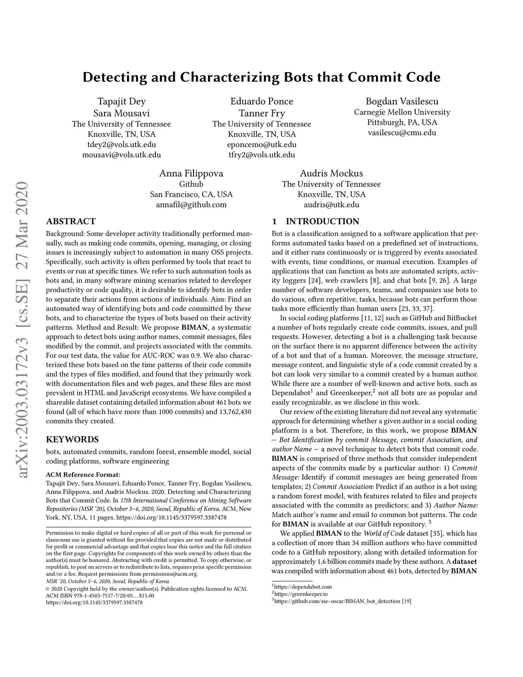 Background: Some developer activity traditionally performed manually, such as making code commits, opening, managing, or closing issues is increasingly subject to automation in many OSS projects. Specifically, such activity is often performed by tools that react to events or run at specific times. We refer to such automation tools as bots and, in many software mining scenarios related to developer productivity or code quality it is desirable to identify bots in order to separate their actions from actions of individuals. Aim: Find an automated way of identifying bots and code committed by these bots, and to characterize the types of bots based on their activity patterns. Method and Result: We propose BIMAN, a systematic approach to detect bots using author names, commit messages, files modified by the commit, and projects associated with the ommits. For our test data, the value for AUC-ROC was 0.9. We also characterized these bots based on the time patterns of their code commits and the types of files modified, and found that they primarily work with documentation files and web pages, and these files are most prevalent in HTML and JavaScript ecosystems. We have compiled a shareable dataset containing detailed information about 461 bots we found (all of whom have more than 1000 commits) and 13,762,430 commits they created.
