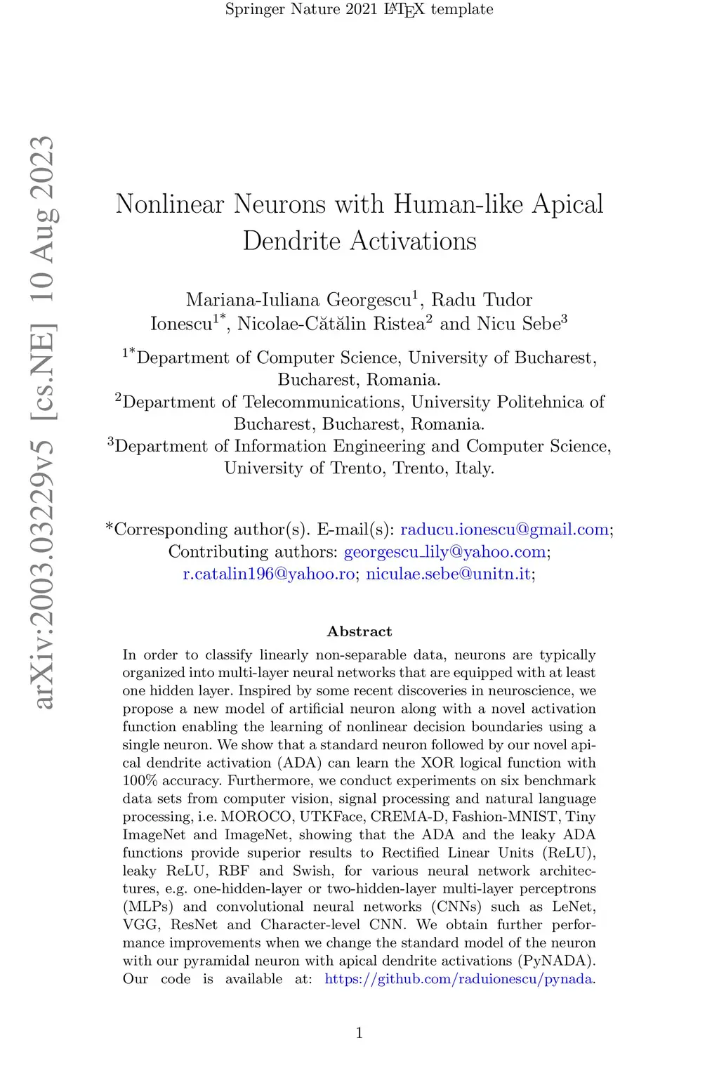 In order to classify linearly non-separable data, neurons are typically organized into multi-layer neural networks that are equipped with at least one hidden layer. Inspired by some recent discoveries in neuroscience, we propose a new model of artificial neuron along with a novel activation function enabling the learning of nonlinear decision boundaries using a single neuron. We show that a standard neuron followed by our novel apical dendrite activation (ADA) can learn the XOR logical function with 100% accuracy. Furthermore, we conduct experiments on six benchmark data sets from computer vision, signal processing and natural language processing, i.e. MOROCO, UTKFace, CREMA-D, Fashion-MNIST, Tiny ImageNet and ImageNet, showing that the ADA and the leaky ADA functions provide superior results to Rectified Linear Units (ReLU), leaky ReLU, RBF and Swish, for various neural network architectures, e.g. one-hidden-layer or two-hidden-layer multi-layer perceptrons (MLPs) and convolutional neural networks (CNNs) such as LeNet, VGG, ResNet and Character-level CNN. We obtain further performance improvements when we change the standard model of the neuron with our pyramidal neuron with apical dendrite activations (PyNADA). Our code is available at: https://github.com/raduionescu/pynada.