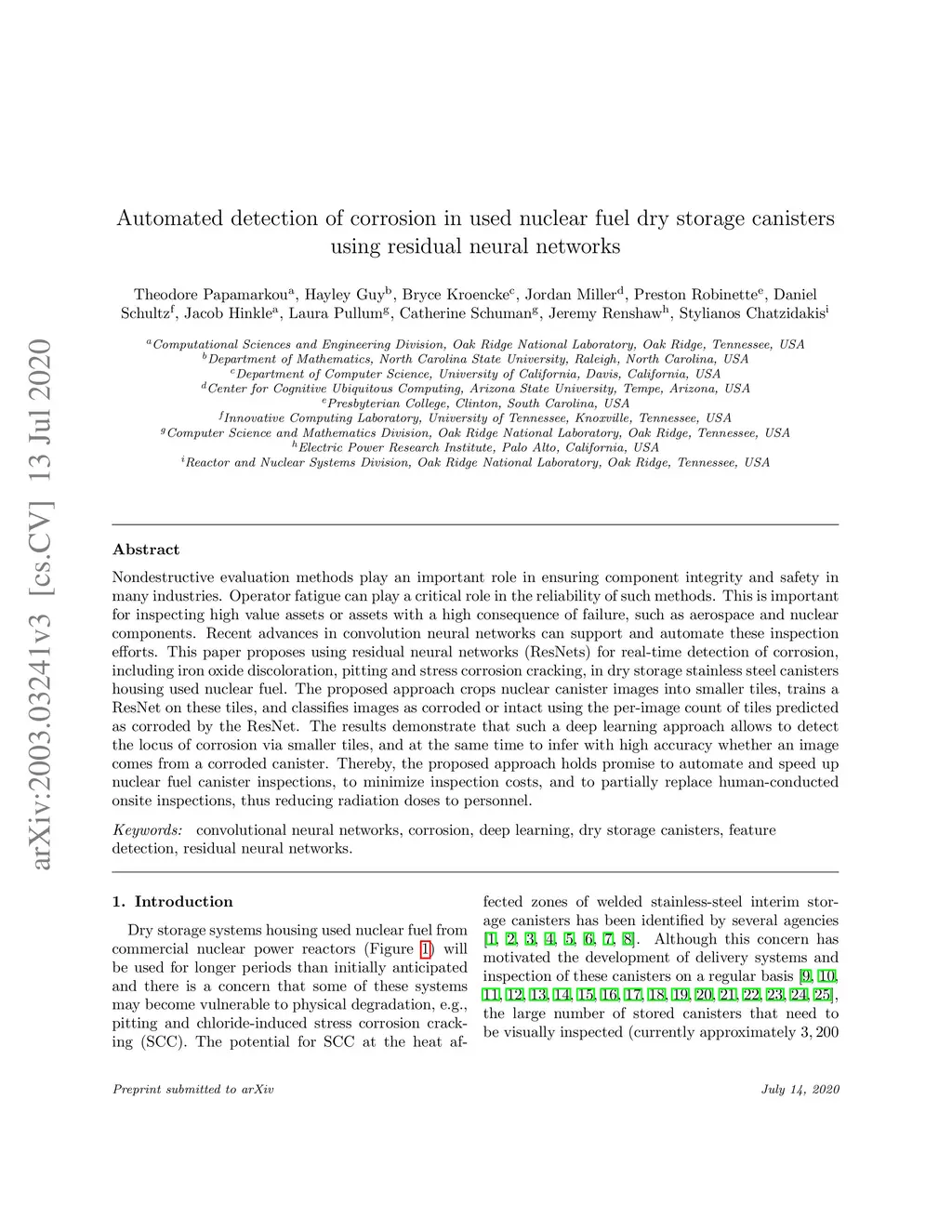 Nondestructive evaluation methods play an important role in ensuring component integrity and safety in many industries. Operator fatigue can play a critical role in the reliability of such methods. This is important for inspecting high value assets or assets with a high consequence of failure, such as aerospace and nuclear components. Recent advances in convolution neural networks can support and automate these inspection efforts. This paper proposes using residual neural networks (ResNets) for real-time detection of corrosion, including iron oxide discoloration, pitting and stress corrosion cracking, in dry storage stainless steel canisters housing used nuclear fuel. The proposed approach crops nuclear canister images into smaller tiles, trains a ResNet on these tiles, and classifies images as corroded or intact using the per-image count of tiles predicted as corroded by the ResNet. The results demonstrate that such a deep learning approach allows to detect the locus of corrosion via smaller tiles, and at the same time to infer with high accuracy whether an image comes from a corroded canister. Thereby, the proposed approach holds promise to automate and speed up nuclear fuel canister inspections, to minimize inspection costs, and to partially replace human-conducted onsite inspections, thus reducing radiation doses to personnel.
