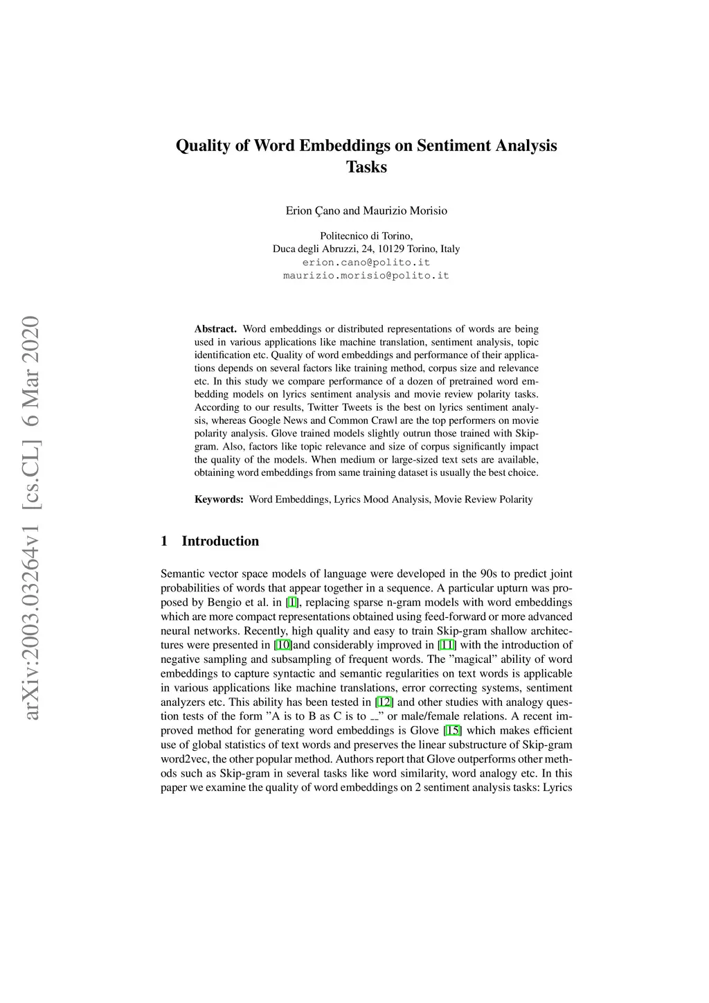 Quality of Word Embeddings on Sentiment Analysis Tasks