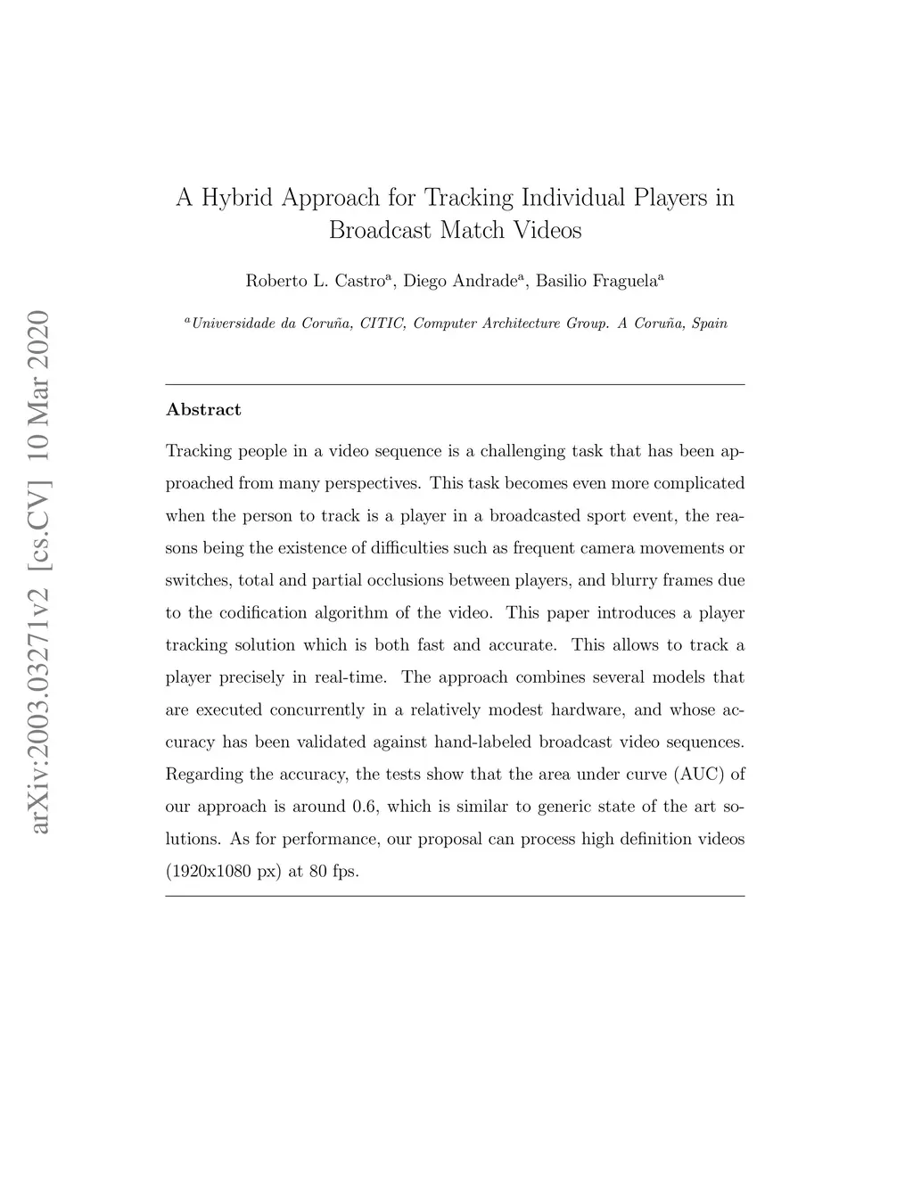Tracking people in a video sequence is a challenging task that has been approached from many perspectives. This task becomes even more complicated when the person to track is a player in a broadcasted sport event, the reasons being the existence of difficulties such as frequent camera movements or switches, total and partial occlusions between players, and blurry frames due to the codification algorithm of the video. This paper introduces a player tracking solution which is both fast and accurate. This allows to track a player precisely in real-time. The approach combines several models that are executed concurrently in a relatively modest hardware, and whose accuracy has been validated against hand-labeled broadcast video sequences. Regarding the accuracy, the tests show that the area under curve (AUC) of our approach is around 0.6, which is similar to generic state of the art solutions. As for performance, our proposal can process high definition videos (1920x1080 px) at 80 fps.