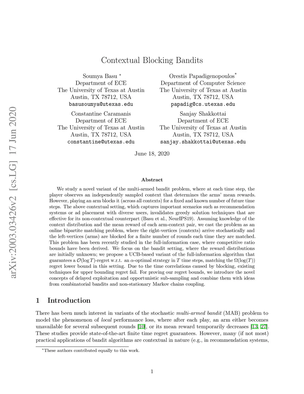 We study a novel variant of the multi-armed bandit problem, where at each time step, the player observes an independently sampled context that determines the arms' mean rewards. However, playing an arm blocks it (across all contexts) for a fixed and known number of future time steps. The above contextual setting, which captures important scenarios such as recommendation systems or ad placement with diverse users, invalidates greedy solution techniques that are effective for its non-contextual counterpart (Basu et al., NeurIPS19). Assuming knowledge of the context distribution and the mean reward of each arm-context pair, we cast the problem as an online bipartite matching problem, where the right-vertices (contexts) arrive stochastically and the left-vertices (arms) are blocked for a finite number of rounds each time they are matched. This problem has been recently studied in the full-information case, where competitive ratio bounds have been derived. We focus on the bandit setting, where the reward distributions are initially unknown; we propose a UCB-based variant of the full-information algorithm that guarantees a -regret w.r.t. an -optimal strategy in time steps, matching the regret lower bound in this setting. Due to the time correlations caused by blocking, existing techniques for upper bounding regret fail. For proving our regret bounds, we introduce the novel concepts of delayed exploitation and opportunistic subsampling and combine them with ideas from combinatorial bandits and non-stationary Markov chains coupling.