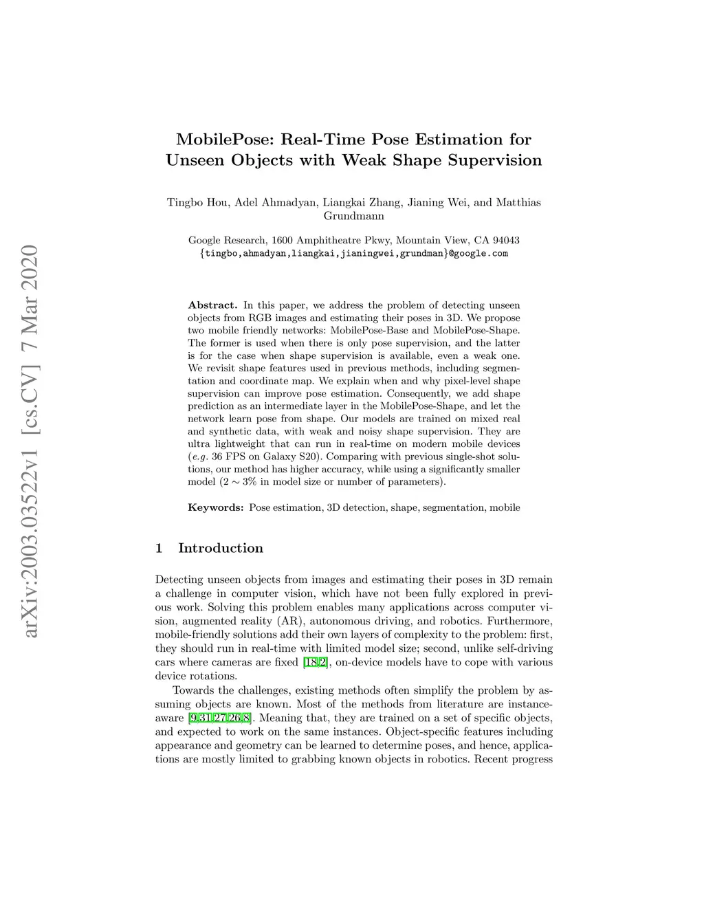 In this paper, we address the problem of detecting unseen objects from RGB images and estimating their poses in 3D. We propose two mobile friendly networks: MobilePose-Base and MobilePose-Shape. The former is used when there is only pose supervision, and the latter is for the case when shape supervision is available, even a weak one. We revisit shape features used in previous methods, including segmentation and coordinate map. We explain when and why pixel-level shape supervision can improve pose estimation. Consequently, we add shape prediction as an intermediate layer in the MobilePose-Shape, and let the network learn pose from shape. Our models are trained on mixed real and synthetic data, with weak and noisy shape supervision. They are ultra lightweight that can run in real-time on modern mobile devices (e.g. 36 FPS on Galaxy S20). Comparing with previous single-shot solutions, our method has higher accuracy, while using a significantly smaller model (2~3% in model size or number of parameters).
