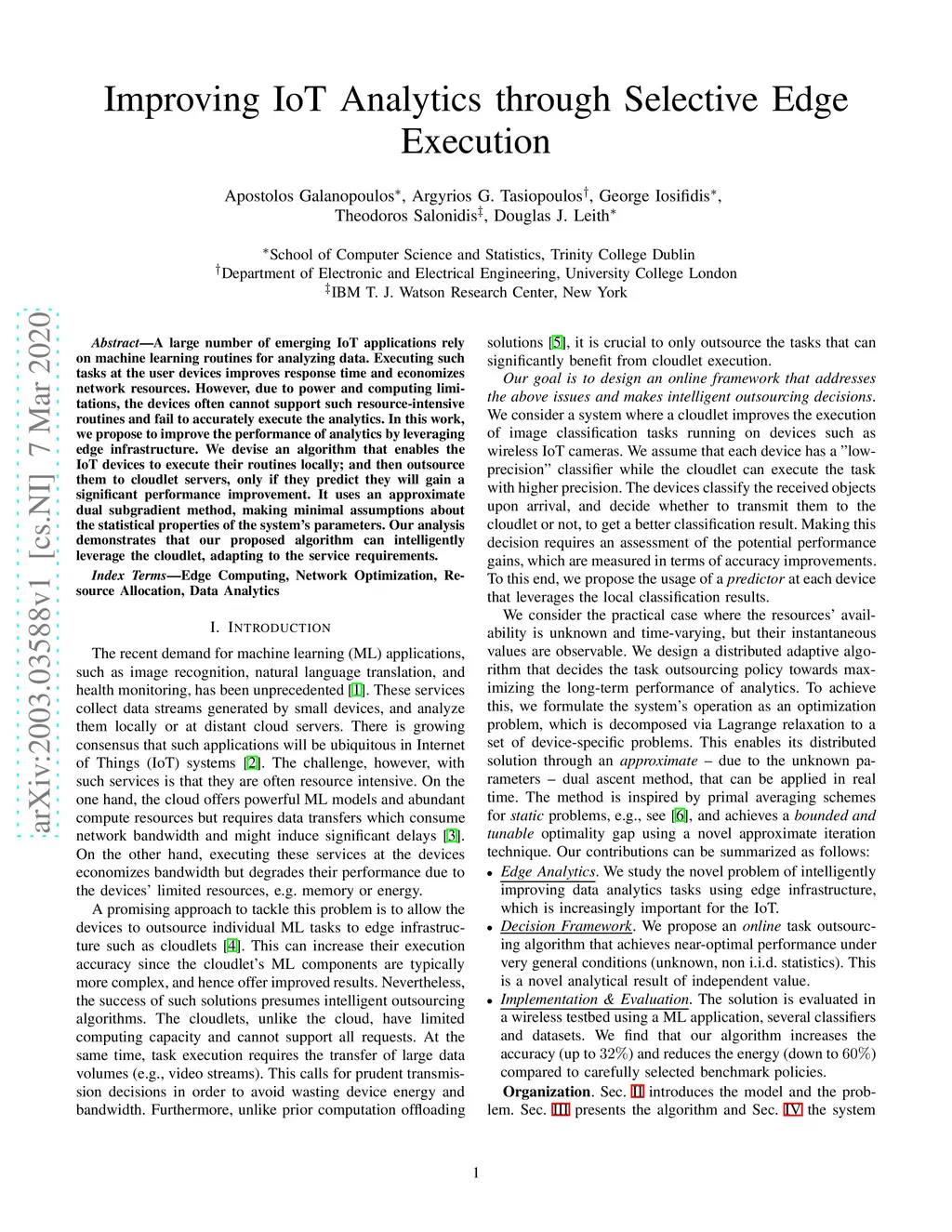 A large number of emerging IoT applications rely on machine learning routines for analyzing data. Executing such tasks at the user devices improves response time and economizes network resources. However, due to power and computing limitations, the devices often cannot support such resource-intensive routines and fail to accurately execute the analytics. In this work, we propose to improve the performance of analytics by leveraging edge infrastructure. We devise an algorithm that enables the IoT devices to execute their routines locally; and then outsource them to cloudlet servers, only if they predict they will gain a significant performance improvement. It uses an approximate dual subgradient method, making minimal assumptions about the statistical properties of the system's parameters. Our analysis demonstrates that our proposed algorithm can intelligently leverage the cloudlet, adapting to the service requirements.