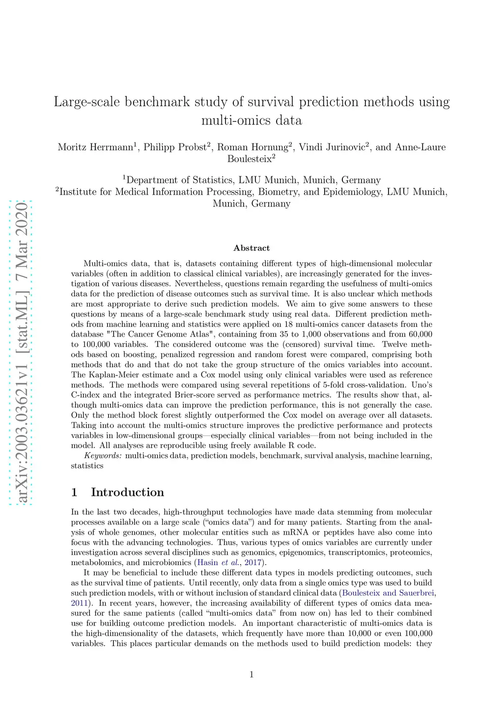 Multi-omics data, that is, datasets containing different types of high-dimensional molecular variables (often in addition to classical clinical variables), are increasingly generated for the investigation of various diseases. Nevertheless, questions remain regarding the usefulness of multi-omics data for the prediction of disease outcomes such as survival time. It is also unclear which methods are most appropriate to derive such prediction models. We aim to give some answers to these questions by means of a large-scale benchmark study using real data. Different prediction methods from machine learning and statistics were applied on 18 multi-omics cancer datasets from the database "The Cancer Genome Atlas", containing from 35 to 1,000 observations and from 60,000 to 100,000 variables. The considered outcome was the (censored) survival time. Twelve methods based on boosting, penalized regression and random forest were compared, comprising both methods that do and that do not take the group structure of the omics variables into account. The Kaplan-Meier estimate and a Cox model using only clinical variables were used as reference methods. The methods were compared using several repetitions of 5-fold cross-validation. Uno's C-index and the integrated Brier-score served as performance metrics. The results show that, although multi-omics data can improve the prediction performance, this is not generally the case. Only the method block forest slightly outperformed the Cox model on average over all datasets. Taking into account the multi-omics structure improves the predictive performance and protects variables in low-dimensional groups - especially clinical variables - from not being included in the model. All analyses are reproducible using freely available R code.