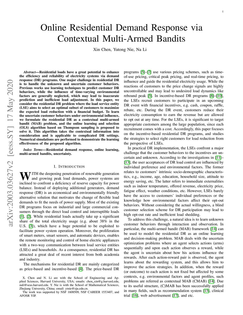 Online Residential Demand Response via Contextual Multi-Armed Bandits