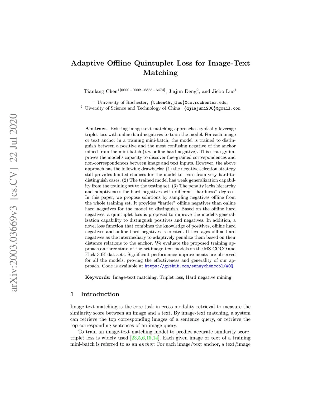 Existing image-text matching approaches typically leverage triplet loss with online hard negatives to train the model. For each image or text anchor in a training mini-batch, the model is trained to distinguish between a positive and the most confusing negative of the anchor mined from the mini-batch (i.e. online hard negative). This strategy improves the model's capacity to discover fine-grained correspondences and non-correspondences between image and text inputs. However, the above approach has the following drawbacks: (1) the negative selection strategy still provides limited chances for the model to learn from very hard-to-distinguish cases. (2) The trained model has weak generalization capability from the training set to the testing set. (3) The penalty lacks hierarchy and adaptiveness for hard negatives with different "hardness" degrees. In this paper, we propose solutions by sampling negatives offline from the whole training set. It provides "harder" offline negatives than online hard negatives for the model to distinguish. Based on the offline hard negatives, a quintuplet loss is proposed to improve the model's generalization capability to distinguish positives and negatives. In addition, a novel loss function that combines the knowledge of positives, offline hard negatives and online hard negatives is created. It leverages offline hard negatives as the intermediary to adaptively penalize them based on their distance relations to the anchor. We evaluate the proposed training approach on three state-of-the-art image-text models on the MS-COCO and Flickr30K datasets. Significant performance improvements are observed for all the models, proving the effectiveness and generality of our approach. Code is available at https://github.com/sunnychencool/AOQ
