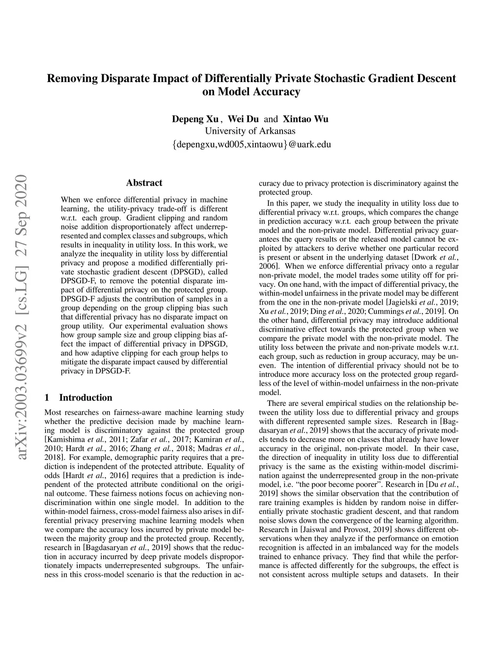 When we enforce differential privacy in machine learning, the utility-privacy trade-off is different w.r.t. each group. Gradient clipping and random noise addition disproportionately affect underrepresented and complex classes and subgroups, which results in inequality in utility loss. In this work, we analyze the inequality in utility loss by differential privacy and propose a modified differentially private stochastic gradient descent (DPSGD), called DPSGD-F, to remove the potential disparate impact of differential privacy on the protected group. DPSGD-F adjusts the contribution of samples in a group depending on the group clipping bias such that differential privacy has no disparate impact on group utility. Our experimental evaluation shows how group sample size and group clipping bias affect the impact of differential privacy in DPSGD, and how adaptive clipping for each group helps to mitigate the disparate impact caused by differential privacy in DPSGD-F.