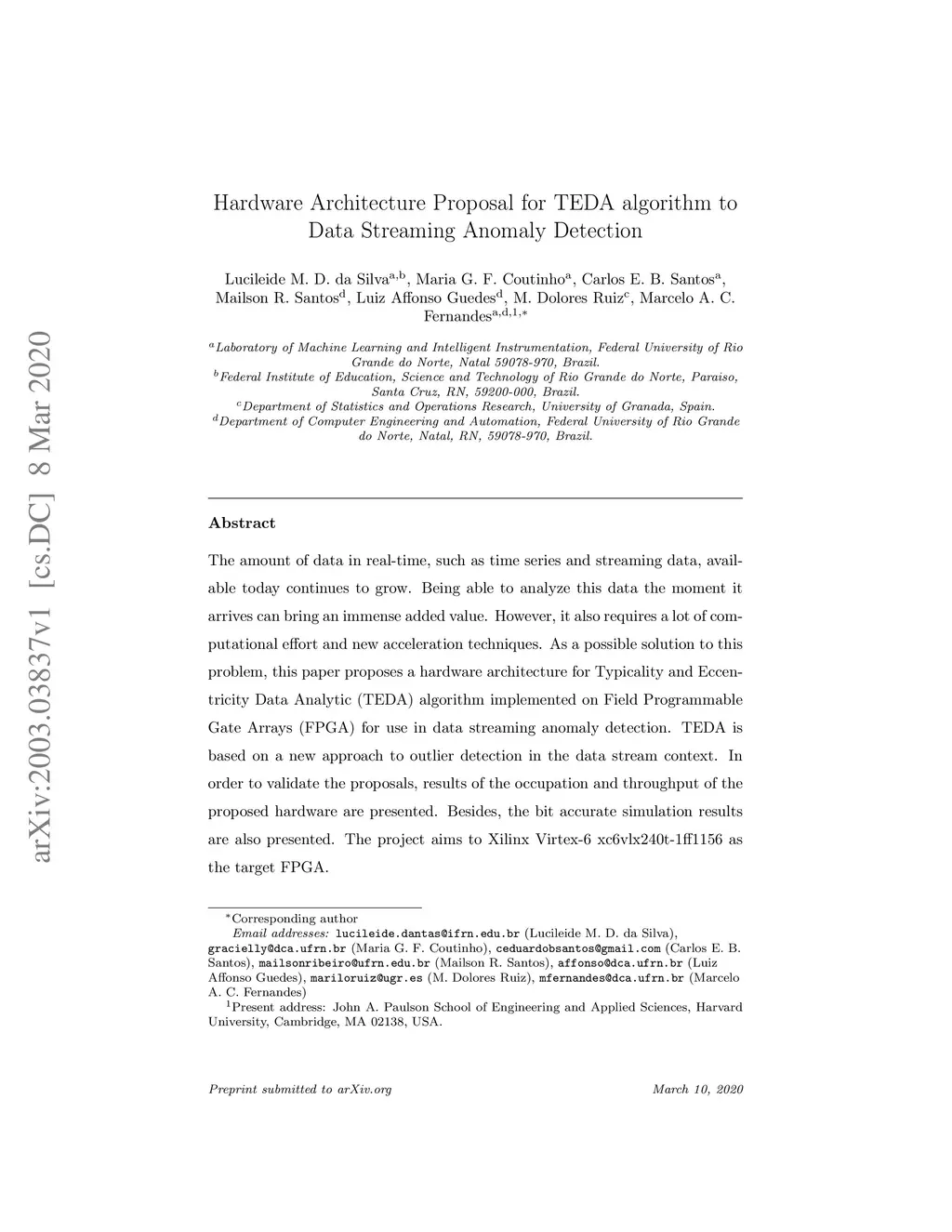 The amount of data in real-time, such as time series and streaming data, available today continues to grow. Being able to analyze this data the moment it arrives can bring an immense added value. However, it also requires a lot of computational effort and new acceleration techniques. As a possible solution to this problem, this paper proposes a hardware architecture for Typicality and Eccentricity Data Analytic (TEDA) algorithm implemented on Field Programmable Gate Arrays (FPGA) for use in data streaming anomaly detection. TEDA is based on a new approach to outlier detection in the data stream context. In order to validate the proposals, results of the occupation and throughput of the proposed hardware are presented. Besides, the bit accurate simulation results are also presented. The project aims to Xilinx Virtex-6 xc6vlx240t-1ff1156 as the target FPGA.