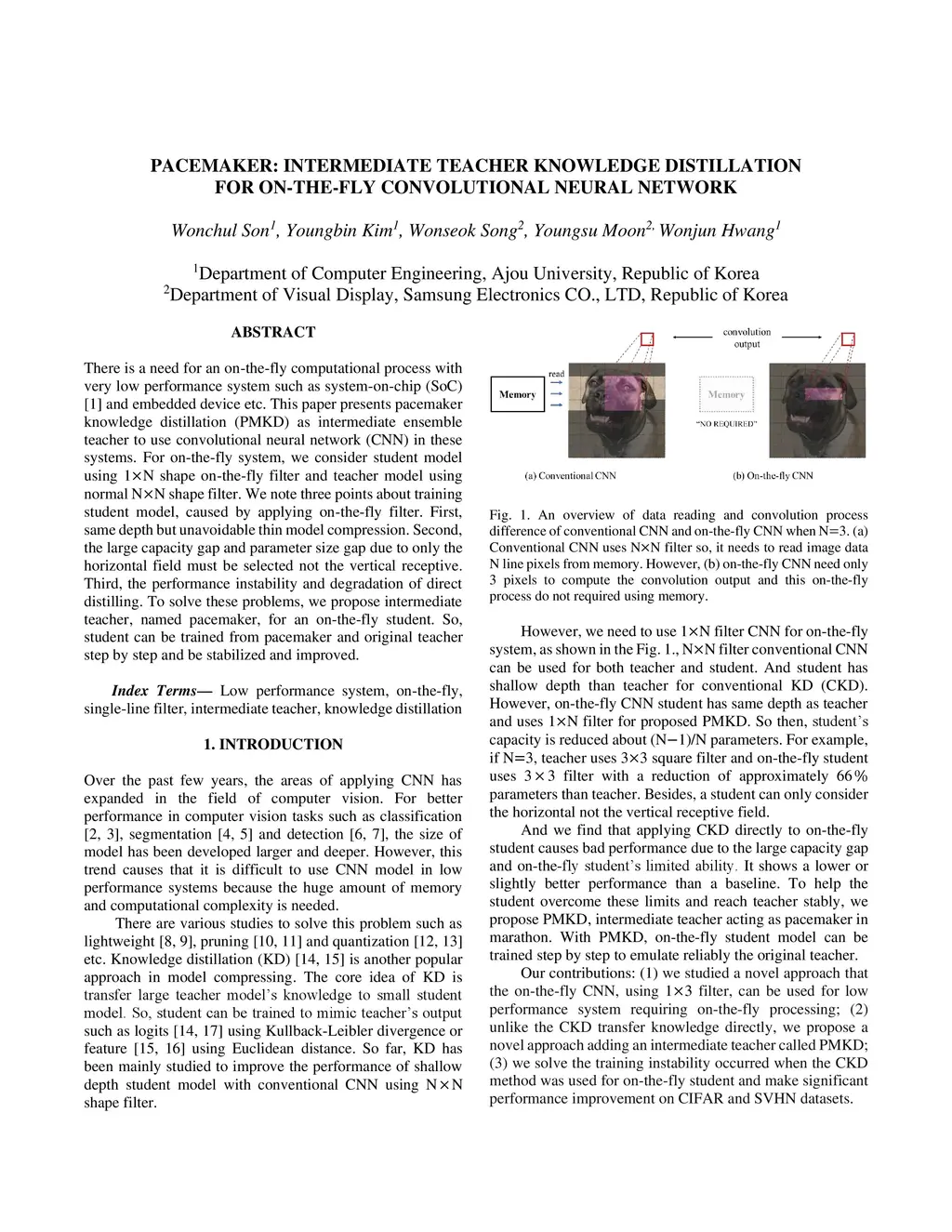 There is a need for an on-the-fly computational process with very low performance system such as system-on-chip (SoC) and embedded device etc. This paper presents pacemaker knowledge distillation as intermediate ensemble teacher to use convolutional neural network in these systems. For on-the-fly system, we consider student model using 1xN shape on-the-fly filter and teacher model using normal NxN shape filter. We note three points about training student model, caused by applying on-the-fly filter. First, same depth but unavoidable thin model compression. Second, the large capacity gap and parameter size gap due to only the horizontal field must be selected not the vertical receptive. Third, the performance instability and degradation of direct distilling. To solve these problems, we propose intermediate teacher, named pacemaker, for an on-the-fly student. So, student can be trained from pacemaker and original teacher step by step. Experiments prove our proposed method make significant performance (accuracy) improvements: on CIFAR100, 5.39% increased in WRN-40-4 than conventional knowledge distillation which shows even low performance than baseline. And we solve train instability, occurred when conventional knowledge distillation was applied without proposed method, by reducing deviation range by applying proposed method pacemaker knowledge distillation.