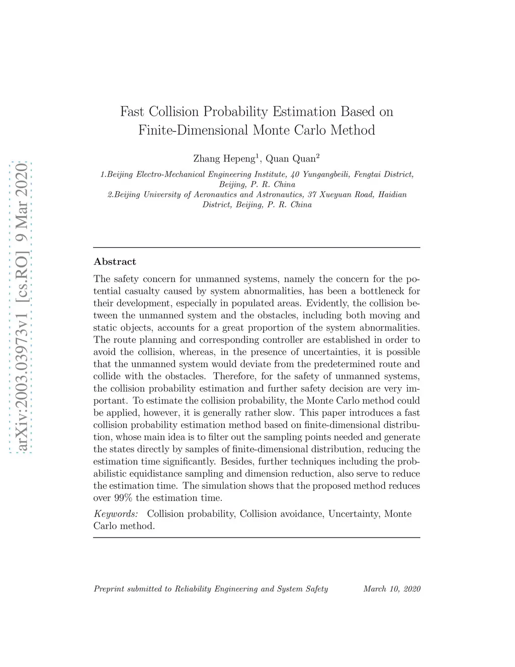 The safety concern for unmanned systems, namely the concern for the potential casualty caused by system abnormalities, has been a bottleneck for their development, especially in populated areas. Evidently, the collision between the unmanned system and the obstacles, including both moving and static objects, accounts for a great proportion of the system abnormalities. The route planning and corresponding controller are established in order to avoid the collision, whereas, in the presence of uncertainties, it is possible that the unmanned system would deviate from the predetermined route and collide with the obstacles. Therefore, for the safety of unmanned systems, collision probability estimation and further safety decision are very important. To estimate the collision probability, the Monte Carlo method could be applied, however, it is generally rather slow. This paper introduces a fast collision probability estimation method based on finite-dimensional distribution, whose main idea is to filter out the sampling points needed and generate the states directly by samples of finite-dimensional distribution, reducing the estimation time significantly. Besides, further techniques including the probabilistic equidistance sampling and dimension reduction, also serve to reduce the estimation time. The simulation shows that the proposed method reduces over 99% of the estimation time.