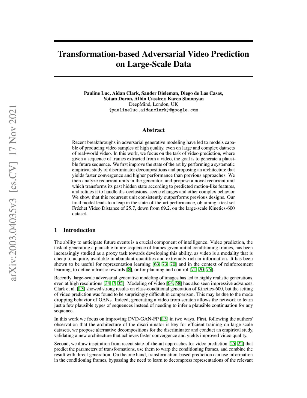 Recent breakthroughs in adversarial generative modeling have led to models capable of producing video samples of high quality, even on large and complex datasets of real-world video. In this work, we focus on the task of video prediction, where given a sequence of frames extracted from a video, the goal is to generate a plausible future sequence. We first improve the state of the art by performing a systematic empirical study of discriminator decompositions and proposing an architecture that yields faster convergence and higher performance than previous approaches. We then analyze recurrent units in the generator, and propose a novel recurrent unit which transforms its past hidden state according to predicted motion-like features, and refines it to handle dis-occlusions, scene changes and other complex behavior. We show that this recurrent unit consistently outperforms previous designs. Our final model leads to a leap in the state-of-the-art performance, obtaining a test set Frechet Video Distance of 25.7, down from 69.2, on the large-scale Kinetics-600 dataset.
