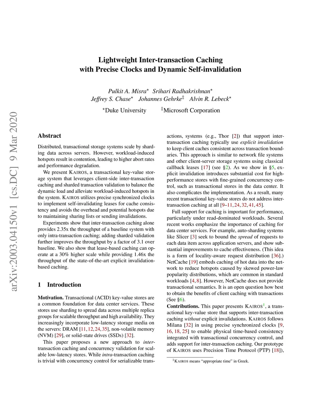 Distributed, transactional storage systems scale by sharding data across servers. However, workload-induced hotspots result in contention, leading to higher abort rates and performance degradation. We present KAIROS, a transactional key-value storage system that leverages client-side inter-transaction caching and sharded transaction validation to balance the dynamic load and alleviate workload-induced hotspots in the system. KAIROS utilizes precise synchronized clocks to implement self-invalidating leases for cache consistency and avoids the overhead and potential hotspots due to maintaining sharing lists or sending invalidations. Experiments show that inter-transaction caching alone provides 2.35x the throughput of a baseline system with only intra-transaction caching; adding sharded validation further improves the throughput by a factor of 3.1 over baseline. We also show that lease-based caching can operate at a 30% higher scale while providing 1.46x the throughput of the state-of-the-art explicit invalidation-based caching.