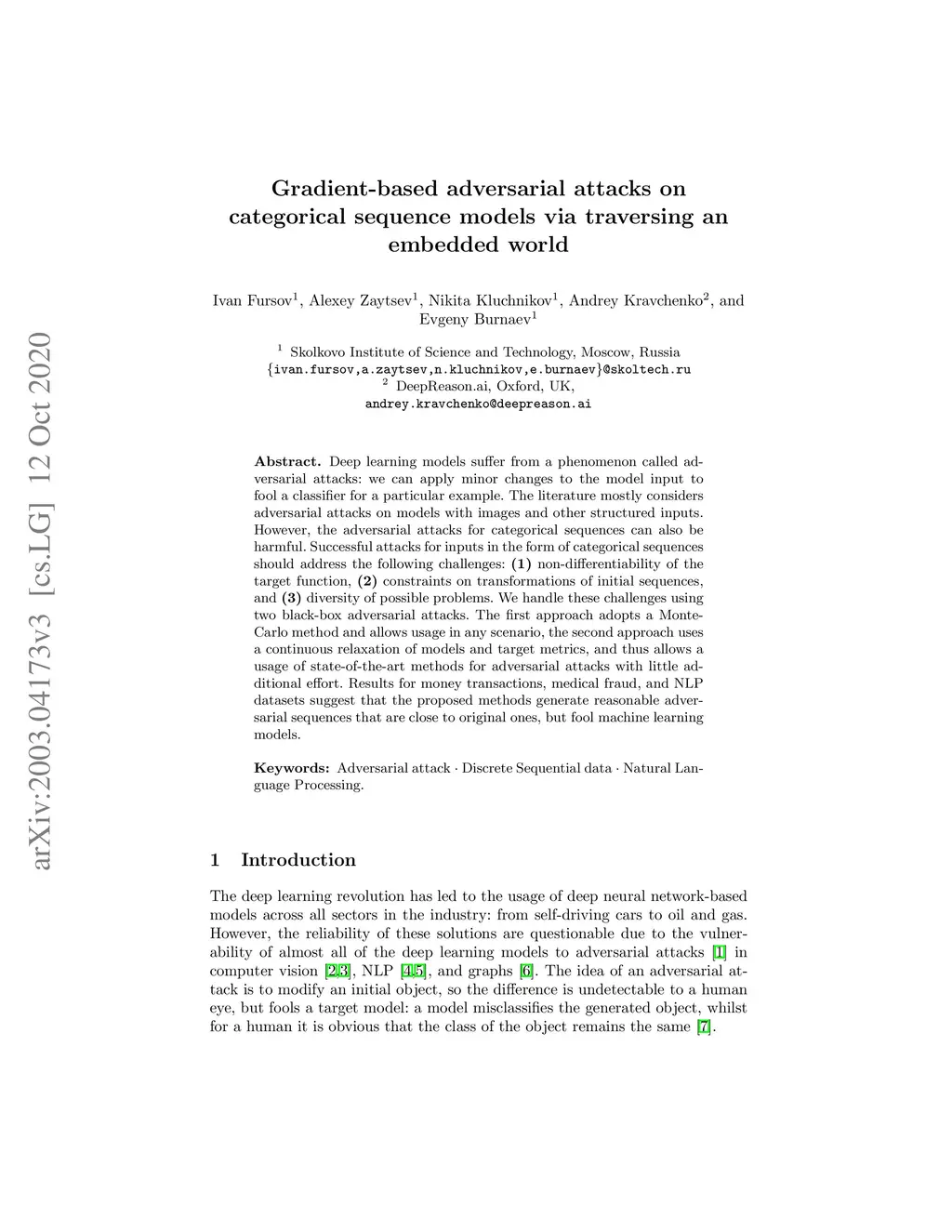 Deep learning models suffer from a phenomenon called adversarial attacks: we can apply minor changes to the model input to fool a classifier for a particular example. The literature mostly considers adversarial attacks on models with images and other structured inputs. However, the adversarial attacks for categorical sequences can also be harmful. Successful attacks for inputs in the form of categorical sequences should address the following challenges: (1) non-differentiability of the target function, (2) constraints on transformations of initial sequences, and (3) diversity of possible problems. We handle these challenges using two black-box adversarial attacks. The first approach adopts a Monte-Carlo method and allows usage in any scenario, the second approach uses a continuous relaxation of models and target metrics, and thus allows usage of state-of-the-art methods for adversarial attacks with little additional effort. Results for money transactions, medical fraud, and NLP datasets suggest that proposed methods generate reasonable adversarial sequences that are close to original ones but fool machine learning models.