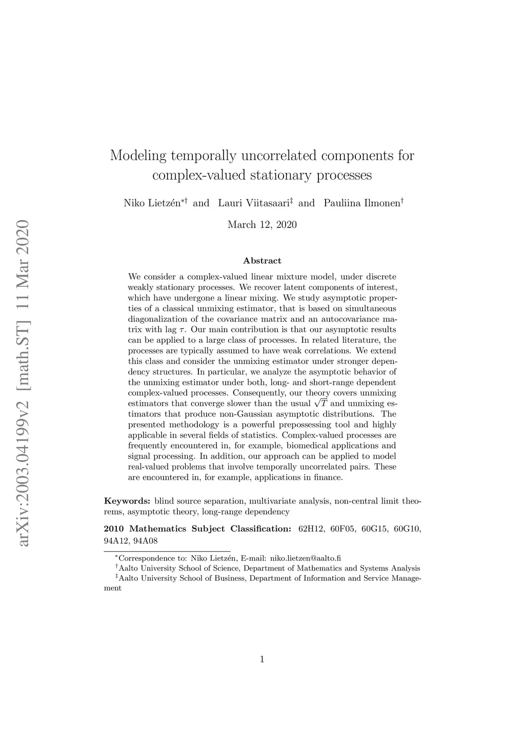 We consider a complex-valued linear mixture model, under discrete weakly stationary processes. We recover latent components of interest, which have undergone a linear mixing. We study asymptotic properties of a classical unmixing estimator, that is based on simultaneous diagonalization of the covariance matrix and an autocovariance matrix with lag . Our main contribution is that our asymptotic results can be applied to a large class of processes. In related literature, the processes are typically assumed to have weak correlations. We extend this class and consider the unmixing estimator under stronger dependency structures. In particular, we analyze the asymptotic behavior of the unmixing estimator under both, long- and short-range dependent complex-valued processes. Consequently, our theory covers unmixing estimators that converge slower than the usual and unmixing estimators that produce non-Gaussian asymptotic distributions. The presented methodology is a powerful prepossessing tool and highly applicable in several fields of statistics. Complex-valued processes are frequently encountered in, for example, biomedical applications and signal processing. In addition, our approach can be applied to model real-valued problems that involve temporally uncorrelated pairs. These are encountered in, for example, applications in finance.