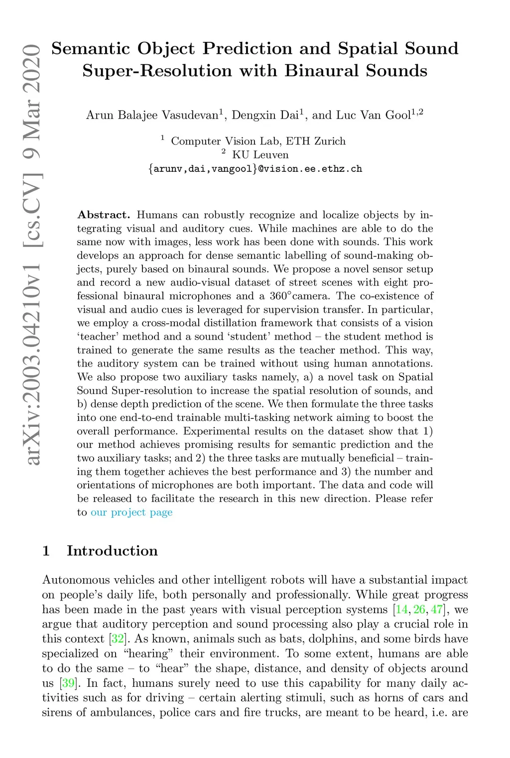 Humans can robustly recognize and localize objects by integrating visual and auditory cues. While machines are able to do the same now with images, less work has been done with sounds. This work develops an approach for dense semantic labelling of sound-making objects, purely based on binaural sounds. We propose a novel sensor setup and record a new audio-visual dataset of street scenes with eight professional binaural microphones and a 360 degree camera. The co-existence of visual and audio cues is leveraged for supervision transfer. In particular, we employ a cross-modal distillation framework that consists of a vision `teacher' method and a sound `student' method -- the student method is trained to generate the same results as the teacher method. This way, the auditory system can be trained without using human annotations. We also propose two auxiliary tasks namely, a) a novel task on Spatial Sound Super-resolution to increase the spatial resolution of sounds, and b) dense depth prediction of the scene. We then formulate the three tasks into one end-to-end trainable multi-tasking network aiming to boost the overall performance. Experimental results on the dataset show that 1) our method achieves promising results for semantic prediction and the two auxiliary tasks; and 2) the three tasks are mutually beneficial -- training them together achieves the best performance and 3) the number and orientations of microphones are both important. The data and code will be released to facilitate the research in this new direction.