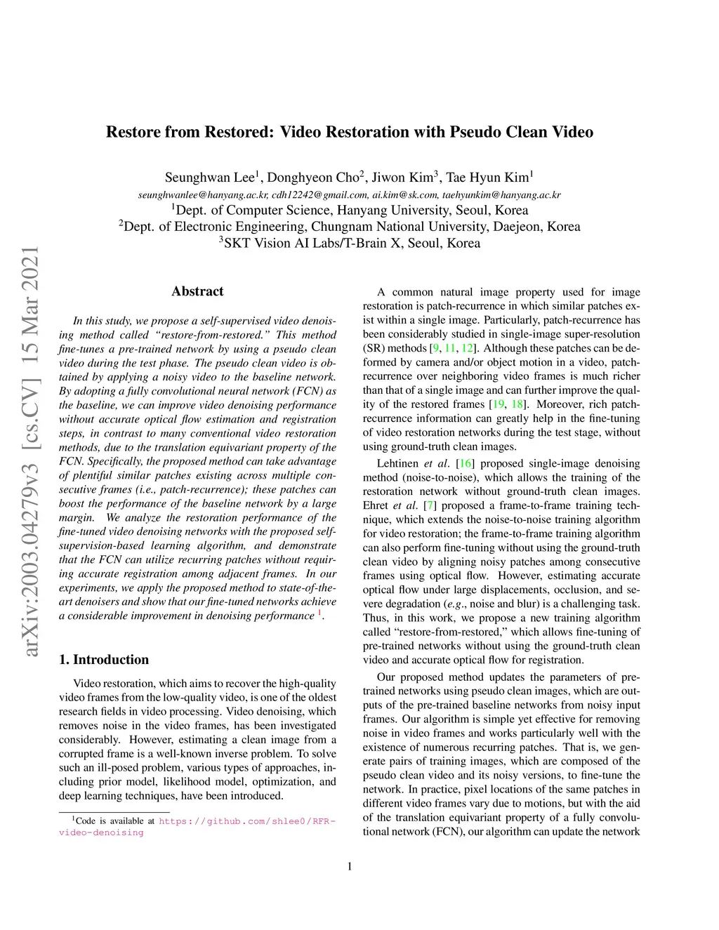 In this study, we propose a self-supervised video denoising method called "restore-from-restored." This method fine-tunes a pre-trained network by using a pseudo clean video during the test phase. The pseudo clean video is obtained by applying a noisy video to the baseline network. By adopting a fully convolutional neural network (FCN) as the baseline, we can improve video denoising performance without accurate optical flow estimation and registration steps, in contrast to many conventional video restoration methods, due to the translation equivariant property of the FCN. Specifically, the proposed method can take advantage of plentiful similar patches existing across multiple consecutive frames (i.e., patch-recurrence); these patches can boost the performance of the baseline network by a large margin. We analyze the restoration performance of the fine-tuned video denoising networks with the proposed self-supervision-based learning algorithm, and demonstrate that the FCN can utilize recurring patches without requiring accurate registration among adjacent frames. In our experiments, we apply the proposed method to state-of-the-art denoisers and show that our fine-tuned networks achieve a considerable improvement in denoising performance.