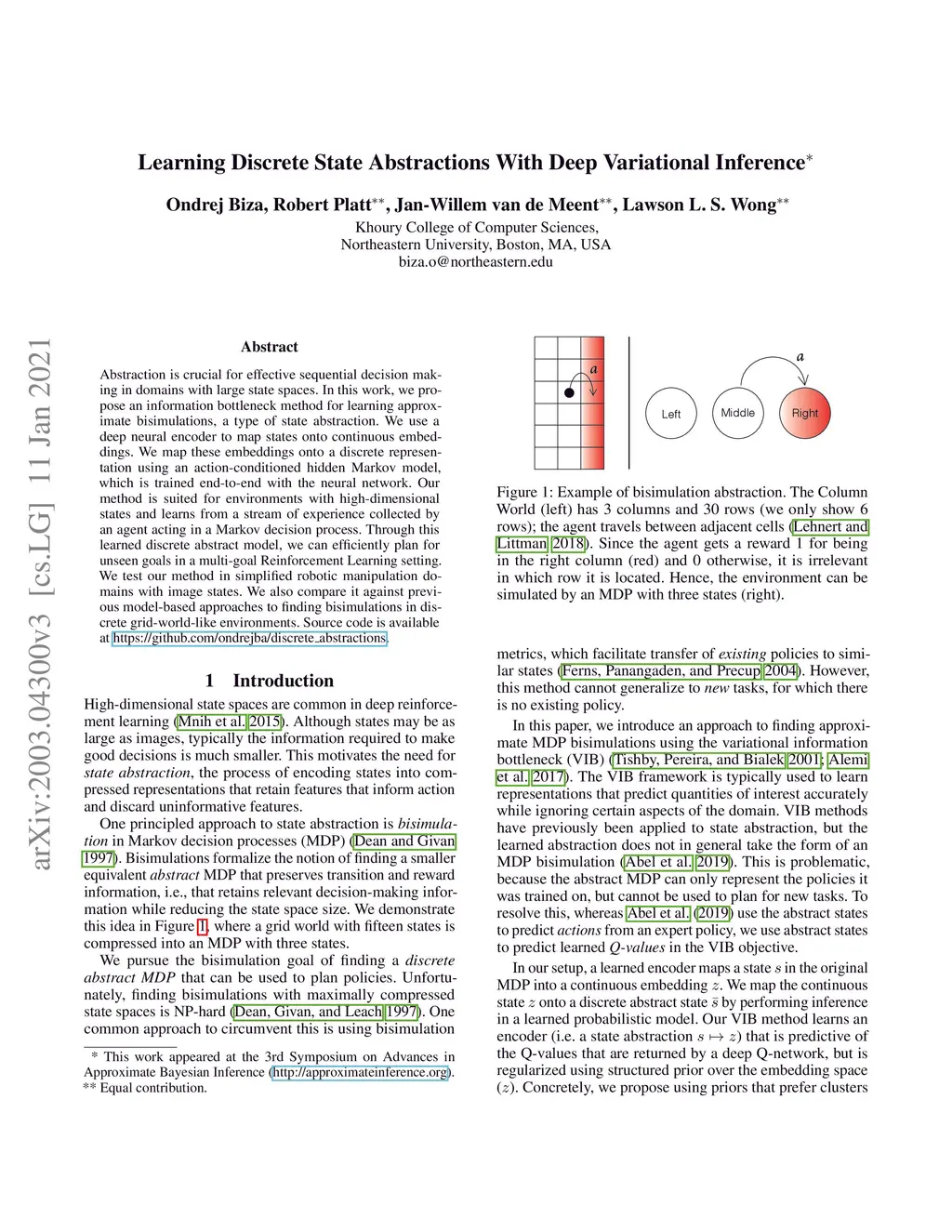Abstraction is crucial for effective sequential decision making in domains with large state spaces. In this work, we propose an information bottleneck method for learning approximate bisimulations, a type of state abstraction. We use a deep neural encoder to map states onto continuous embeddings. We map these embeddings onto a discrete representation using an action-conditioned hidden Markov model, which is trained end-to-end with the neural network. Our method is suited for environments with high-dimensional states and learns from a stream of experience collected by an agent acting in a Markov decision process. Through this learned discrete abstract model, we can efficiently plan for unseen goals in a multi-goal Reinforcement Learning setting. We test our method in simplified robotic manipulation domains with image states. We also compare it against previous model-based approaches to finding bisimulations in discrete grid-world-like environments. Source code is available at https://github.com/ondrejba/discrete_abstractions.