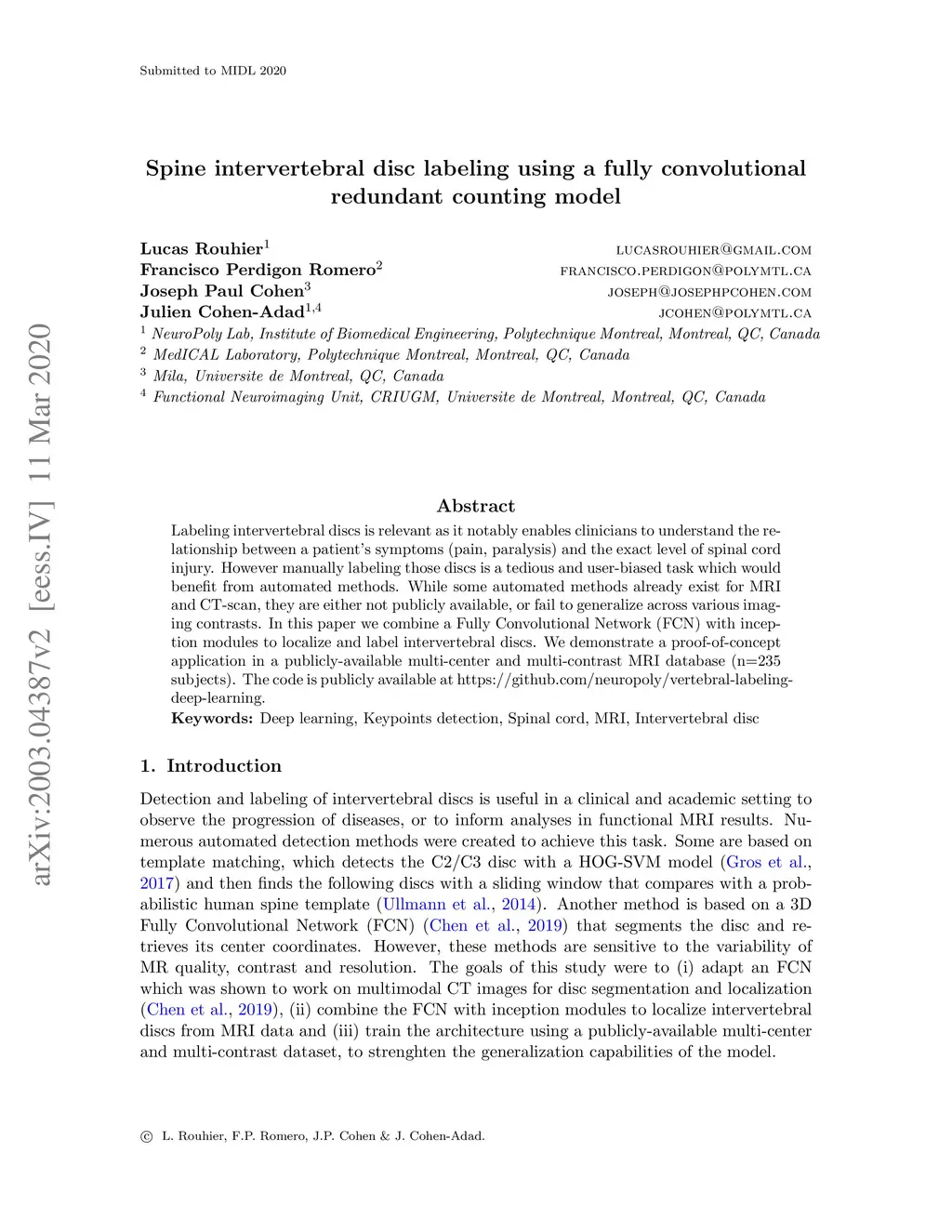 Labeling intervertebral discs is relevant as it notably enables clinicians to understand the relationship between a patient's symptoms (pain, paralysis) and the exact level of spinal cord injury. However manually labeling those discs is a tedious and user-biased task which would benefit from automated methods. While some automated methods already exist for MRI and CT-scan, they are either not publicly available, or fail to generalize across various imaging contrasts. In this paper we combine a Fully Convolutional Network (FCN) with inception modules to localize and label intervertebral discs. We demonstrate a proof-of-concept application in a publicly-available multi-center and multi-contrast MRI database (n=235 subjects). The code is publicly available at https://github.com/neuropoly/vertebral-labeling-deep-learning.