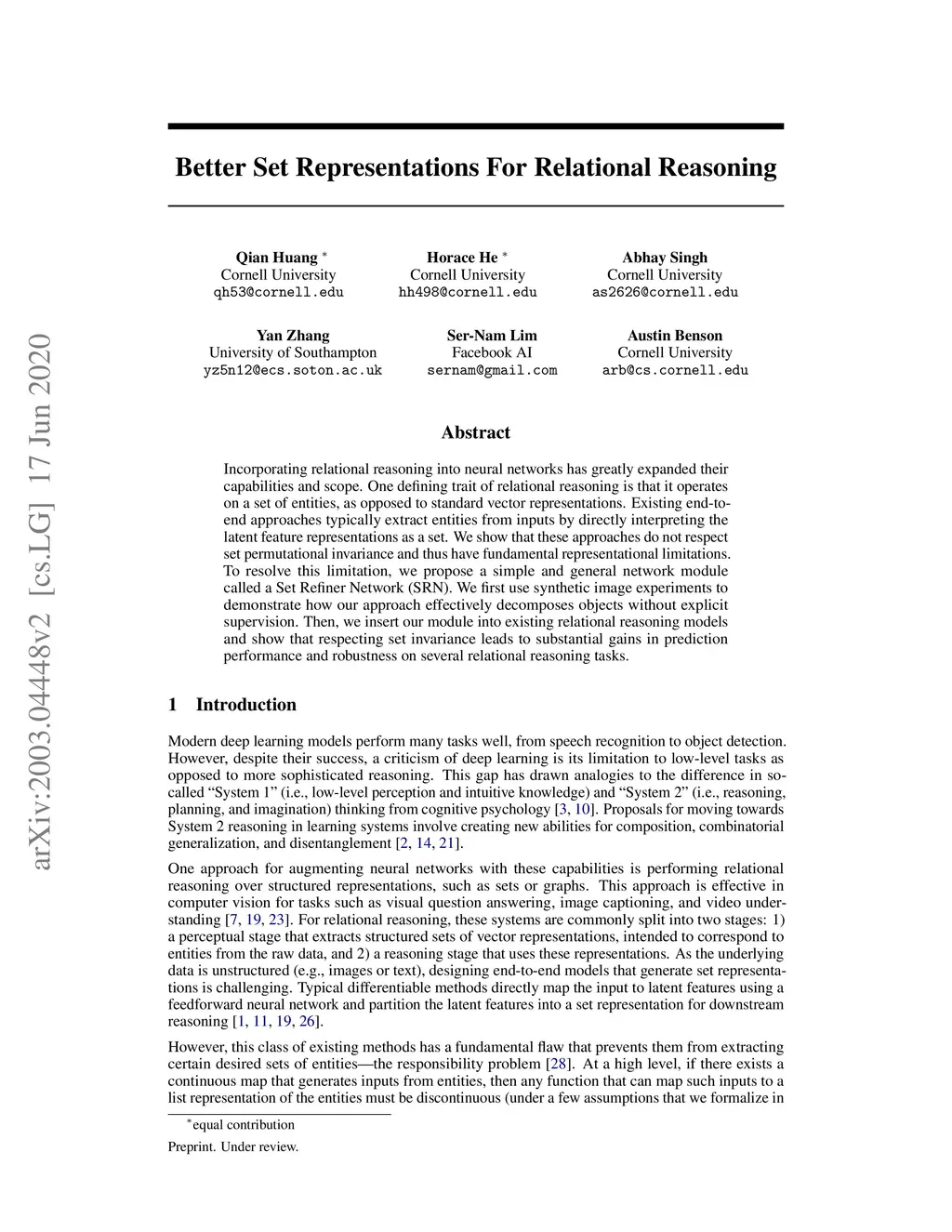 Incorporating relational reasoning into neural networks has greatly expanded their capabilities and scope. One defining trait of relational reasoning is that it operates on a set of entities, as opposed to standard vector representations. Existing end-to-end approaches typically extract entities from inputs by directly interpreting the latent feature representations as a set. We show that these approaches do not respect set permutational invariance and thus have fundamental representational limitations. To resolve this limitation, we propose a simple and general network module called a Set Refiner Network (SRN). We first use synthetic image experiments to demonstrate how our approach effectively decomposes objects without explicit supervision. Then, we insert our module into existing relational reasoning models and show that respecting set invariance leads to substantial gains in prediction performance and robustness on several relational reasoning tasks.