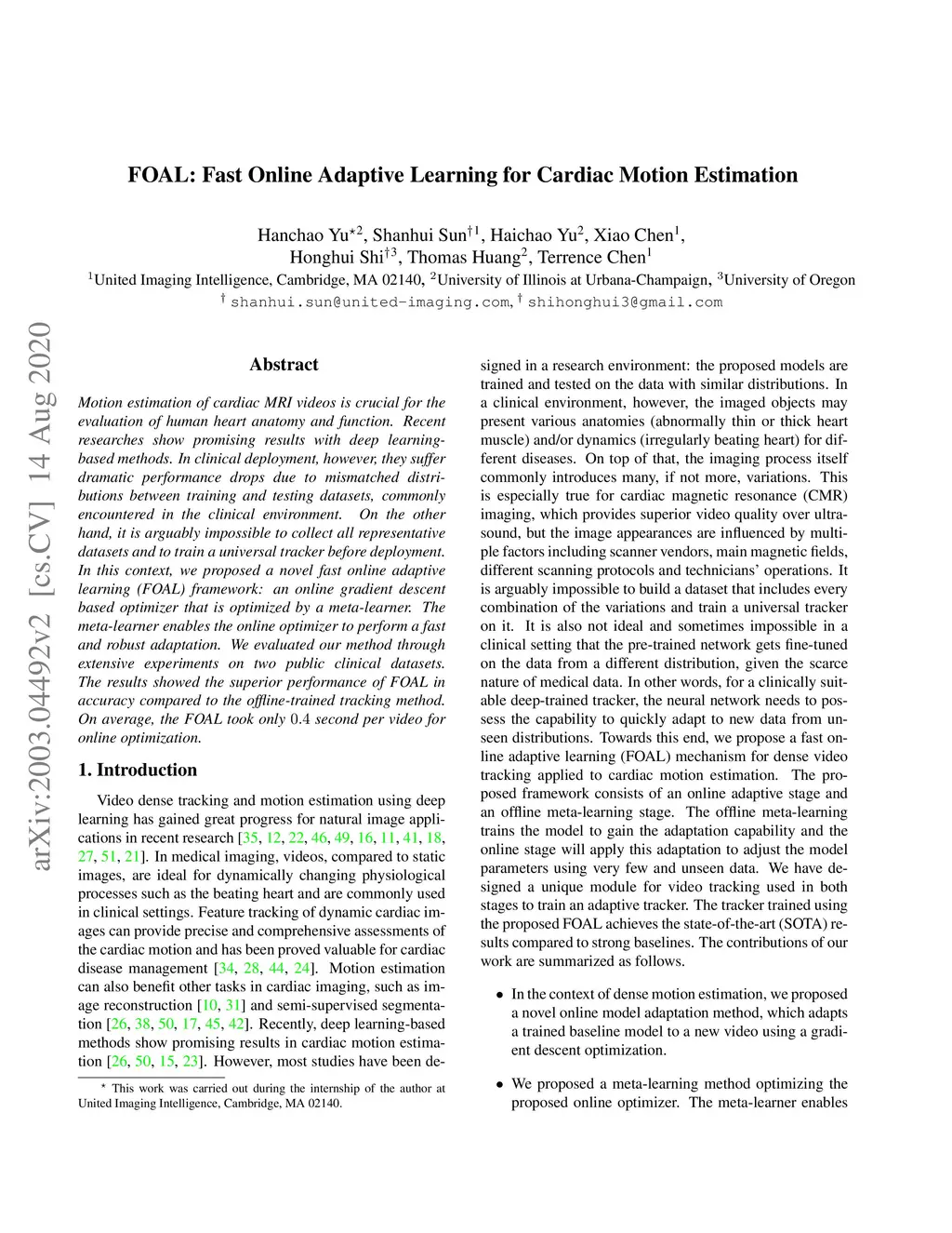 FOAL: Fast Online Adaptive Learning for Cardiac Motion Estimation