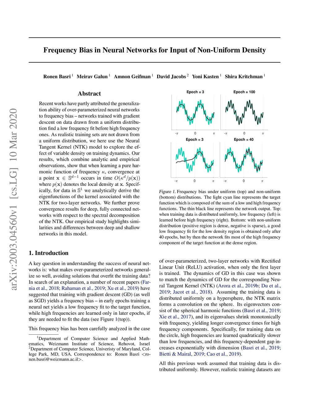 Recent works have partly attributed the generalization ability of over-parameterized neural networks to frequency bias -- networks trained with gradient descent on data drawn from a uniform distribution find a low frequency fit before high frequency ones. As realistic training sets are not drawn from a uniform distribution, we here use the Neural Tangent Kernel (NTK) model to explore the effect of variable density on training dynamics. Our results, which combine analytic and empirical observations, show that when learning a pure harmonic function of frequency , convergence at a point occurs in time where denotes the local density at . Specifically, for data in we analytically derive the eigenfunctions of the kernel associated with the NTK for two-layer networks. We further prove convergence results for deep, fully connected networks with respect to the spectral decomposition of the NTK. Our empirical study highlights similarities and differences between deep and shallow networks in this model.
