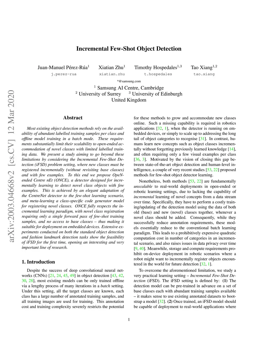 Most existing object detection methods rely on the availability of abundant labelled training samples per class and offline model training in a batch mode. These requirements substantially limit their scalability to open-ended accommodation of novel classes with limited labelled training data. We present a study aiming to go beyond these limitations by considering the Incremental Few-Shot Detection (iFSD) problem setting, where new classes must be registered incrementally (without revisiting base classes) and with few examples. To this end we propose OpeN-ended Centre nEt (ONCE), a detector designed for incrementally learning to detect novel class objects with few examples. This is achieved by an elegant adaptation of the CentreNet detector to the few-shot learning scenario, and meta-learning a class-specific code generator model for registering novel classes. ONCE fully respects the incremental learning paradigm, with novel class registration requiring only a single forward pass of few-shot training samples, and no access to base classes -- thus making it suitable for deployment on embedded devices. Extensive experiments conducted on both the standard object detection and fashion landmark detection tasks show the feasibility of iFSD for the first time, opening an interesting and very important line of research.
