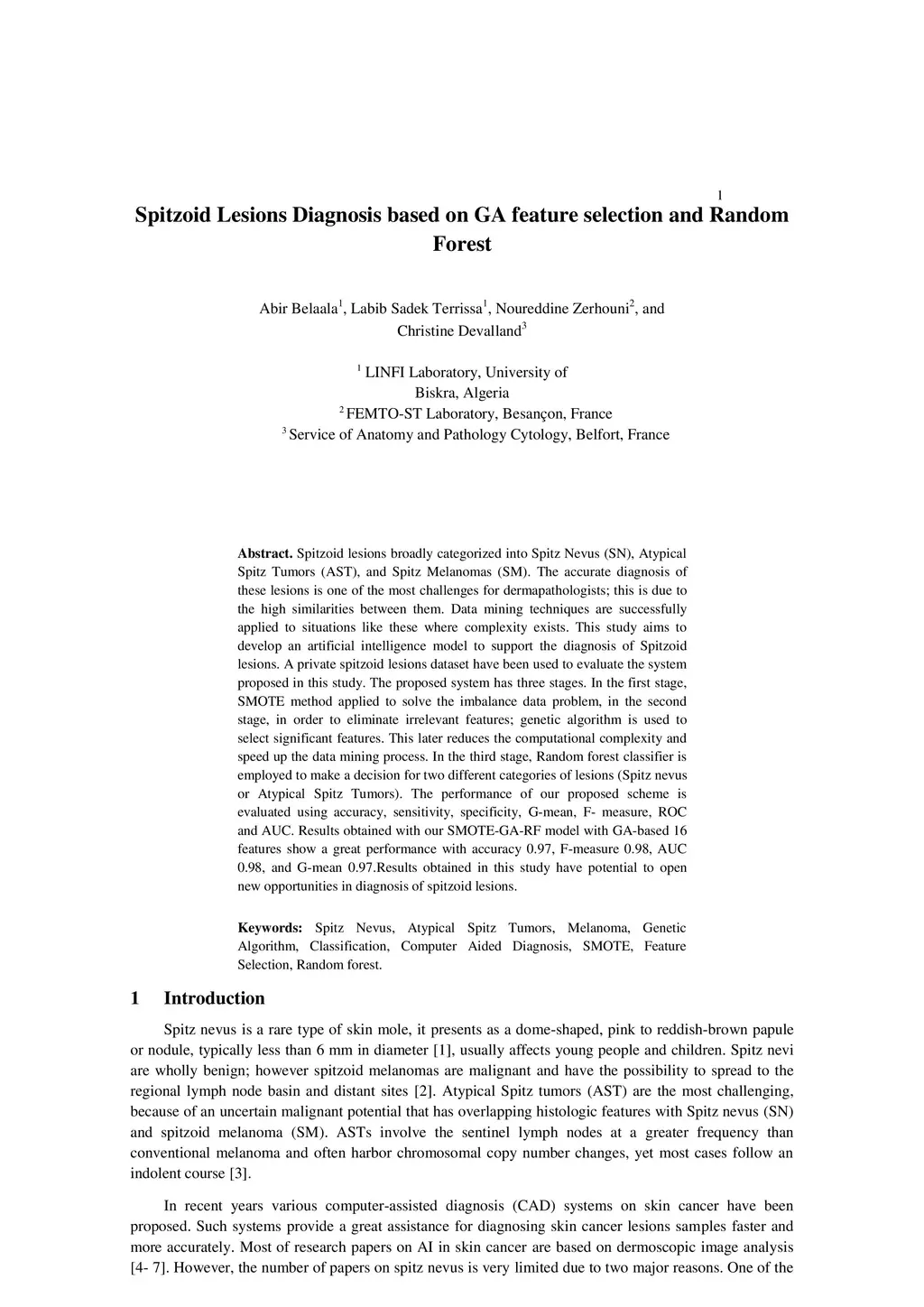 Spitzoid Lesions Diagnosis based on GA feature selection and Random