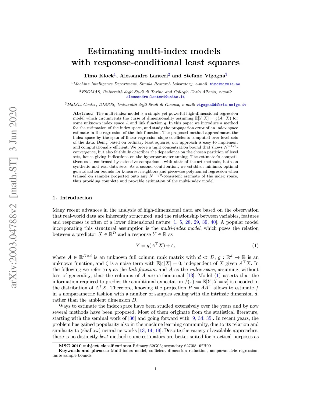 The multi-index model is a simple yet powerful high-dimensional regression model which circumvents the curse of dimensionality assuming $ \mathbb{E} [ Y | X ] = g(A^\top X) $ for some unknown index space and link function . In this paper we introduce a method for the estimation of the index space, and study the propagation error of an index space estimate in the regression of the link function. The proposed method approximates the index space by the span of linear regression slope coefficients computed over level sets of the data. Being based on ordinary least squares, our approach is easy to implement and computationally efficient. We prove a tight concentration bound that shows convergence, but also faithfully describes the dependence on the chosen partition of level sets, hence giving indications on the hyperparameter tuning. The estimator's competitiveness is confirmed by extensive comparisons with state-of-the-art methods, both on synthetic and real data sets. As a second contribution, we establish minimax optimal generalization bounds for k-nearest neighbors and piecewise polynomial regression when trained on samples projected onto an estimate of the index space, thus providing complete and provable estimation of the multi-index model.